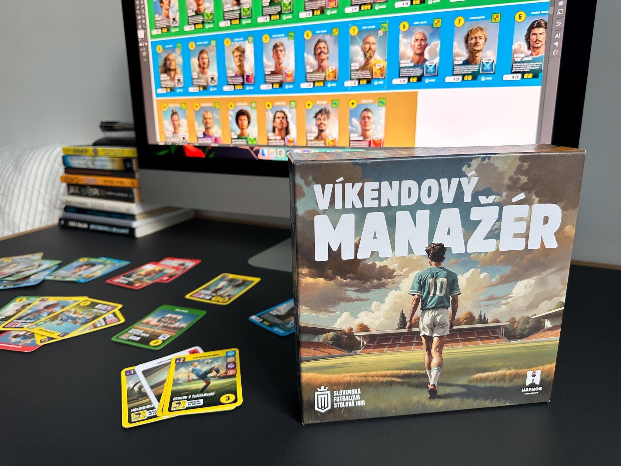 Detailný záber na obal hry a proces tvorby kariet hráčov.
