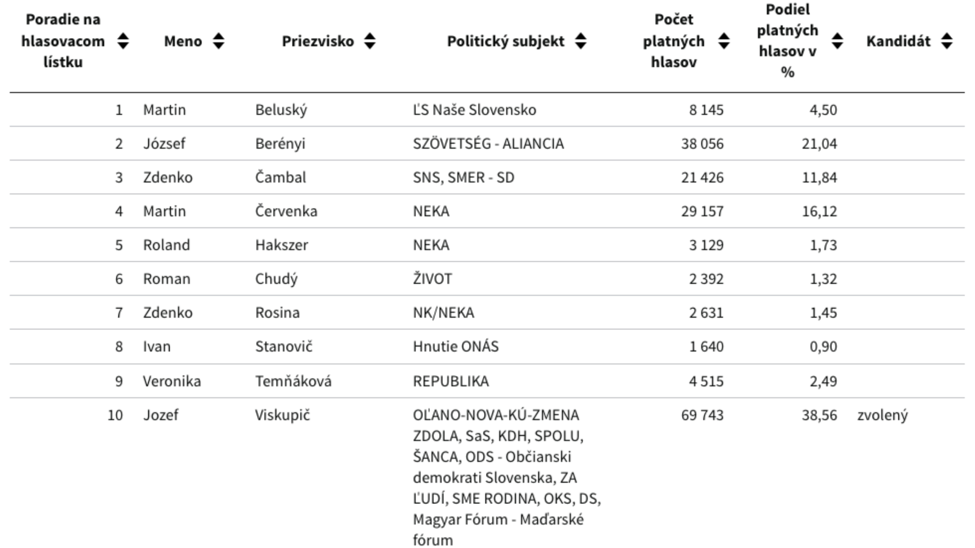 Počet a podiel platných hlasov odovzdaných pre kandidátov na predsedov Trnavského kraja.