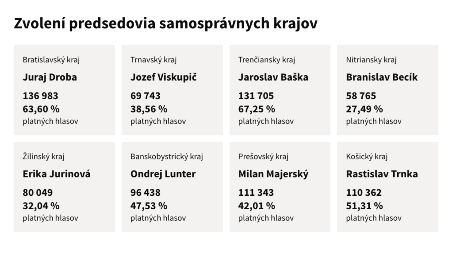 Výsledky zvolených županov do samosprávnych krajov v každom kraji SR.