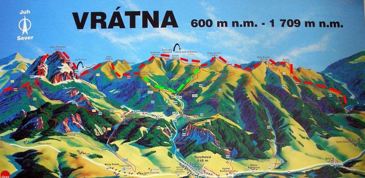 Včera sme sa rozhodli zdolať aj tú poslednú, chýbajúcu časť. Autom sme cez skalné brány takzvaných Tiesňav vstúpili do Vrátnej doliny a pokračovali k lanovke, ktorá chodí pod Chlebom. S lanovkou sme ani nerátali (cez týždeň a teraz obzvlášť nepremáva). Vedeli sme, že je pred nami azda najhorší úsek dňa. Vyjsť z doliny až hore na hrebeň.