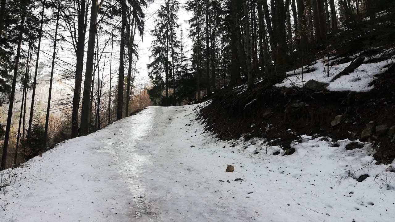 Už sme si mysleli, že je v podstate koniec našej fatranskej cesty. Cesta od chaty na parkovisko k lanovke, nám vďaka zľadovatenému terénu (voda, ktorá zjavne zišla z rúbanísk a na chodníkoch zamrzla) dala zabrať možno najviac.