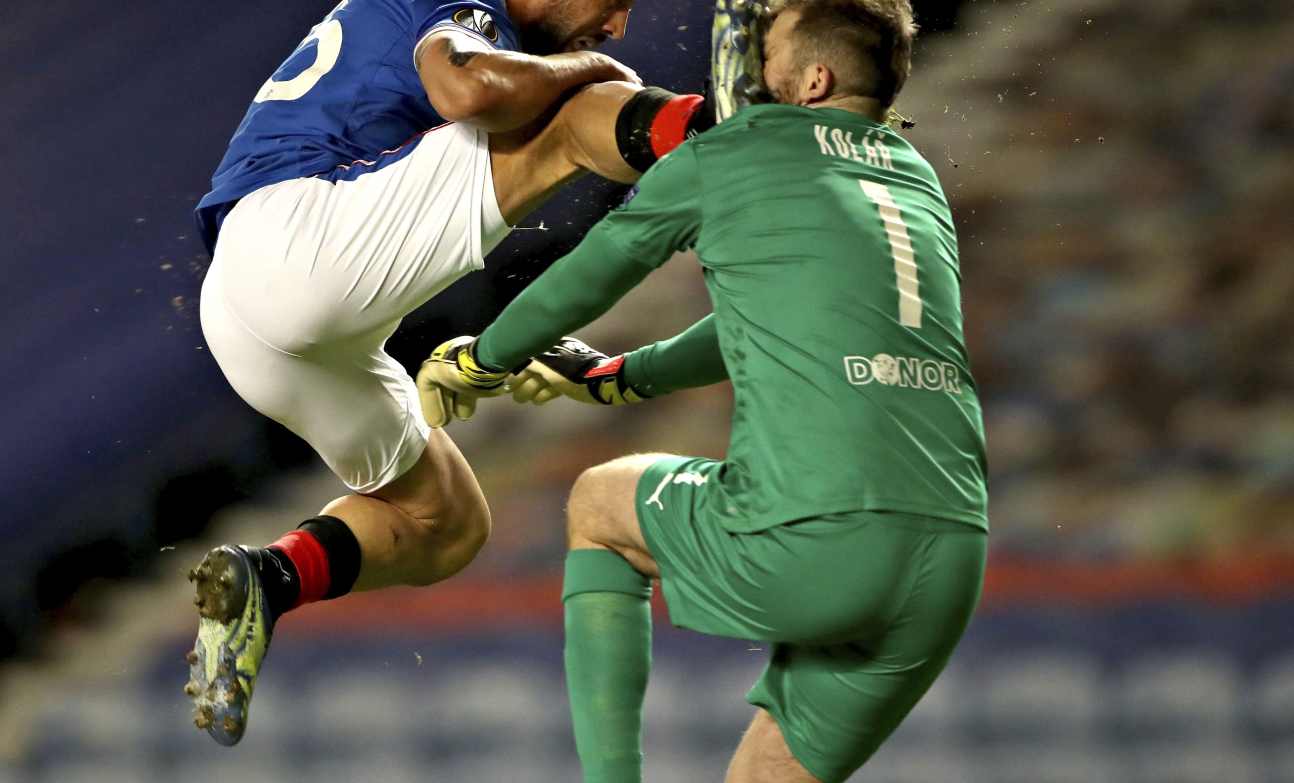 zdroj: TASR/AP/Andrew Milligan. Útočník Glasgowa Kemar Roofe kope do hlavy českého brankára Slavie Ondřeja Kolářa
