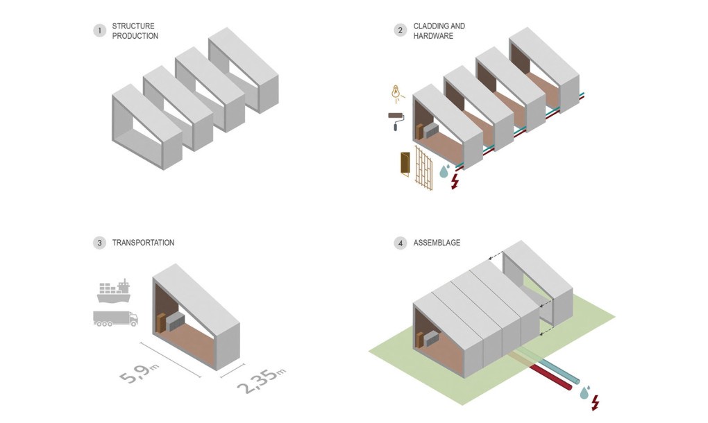Tento typ domu sa dokáže postaviť za relatívne krátky čas, resp. tri dni. Gomos je nový modulárny stavebný systém pozostávajúci z betónových modulov vyrobených v továrni, z ktorých sa dá postaviť prístrešok.