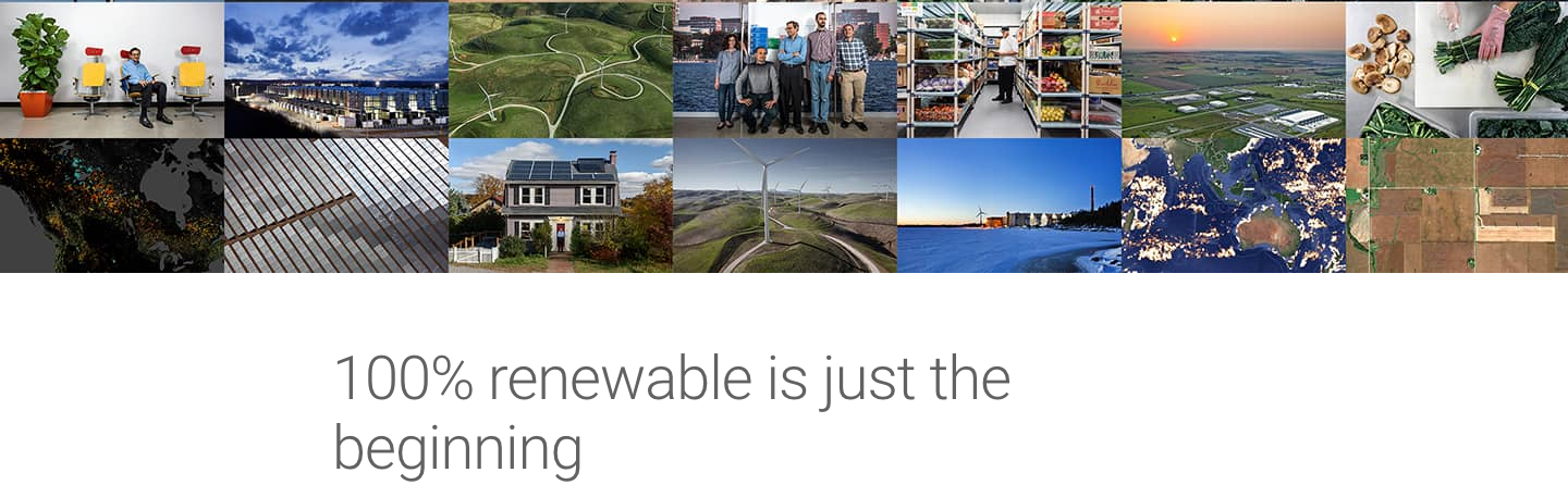V roku 2011 Google spotreboval zhruba 0,0013 % svetovej energie pre svoje dátové centrá a kancelárie. Ako roky plynú, táto spotreba naďalej rastie a zanecháva za sebou veľký účet a stopu v ekológii. Google však na svojom blogu oznámil, že nasledujúci rok bude 100 % elektrickej energie pochádzať už len z obnoviteľných zdrojov energie. Technologický gigant sa chystá nakúpiť 2,6 gigawattov (2 600 megawattov) veterných fariem a solárnych panelov, ktoré pre spoločnosť vyprodukujú 100 % elektrickej energie v roku 2017.
