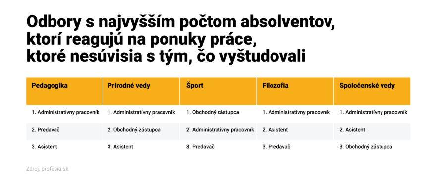 Prvá pozícia, ktorá súvisí s ich odborom, bola v rebríčku paradoxne až na 36. mieste a išlo o učiteľa materskej školy. Zložitú situáciu sledujú pracovné portály aj pri absolventoch zdravotníctva. Tí reagovali najčastejšie taktiež na pozíciu administratívneho pracovníka.