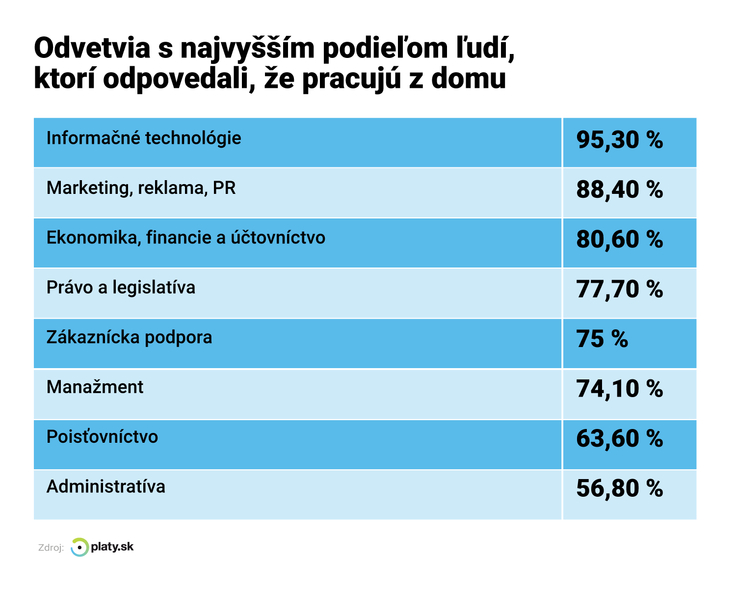 Odvetvia s najvyšším počtom respondentov, ktorí uviedli, že ich typ práce nie jej možné robiť z domu, sú najmä cestovný ruch a gastro, výroba alebo doprava a špedícia. Medzi odvetvia, kde ľudia aktuálne pracujú z domu, patria najmä informačné technológie, marketing alebo ekonomika a financie.