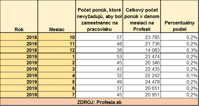 „Čo sa týka pracovných ponúk na Profesia.sk, pri ktorých vyslovene stačí pracovať z domu a ide o trvalý, či skrátený pracovný pomer, tak tieto počty sú naozaj iba v desiatkach. Momentálne je to približne 30 aktívnych pracovných inzerátov,“ doplnila Richterová.