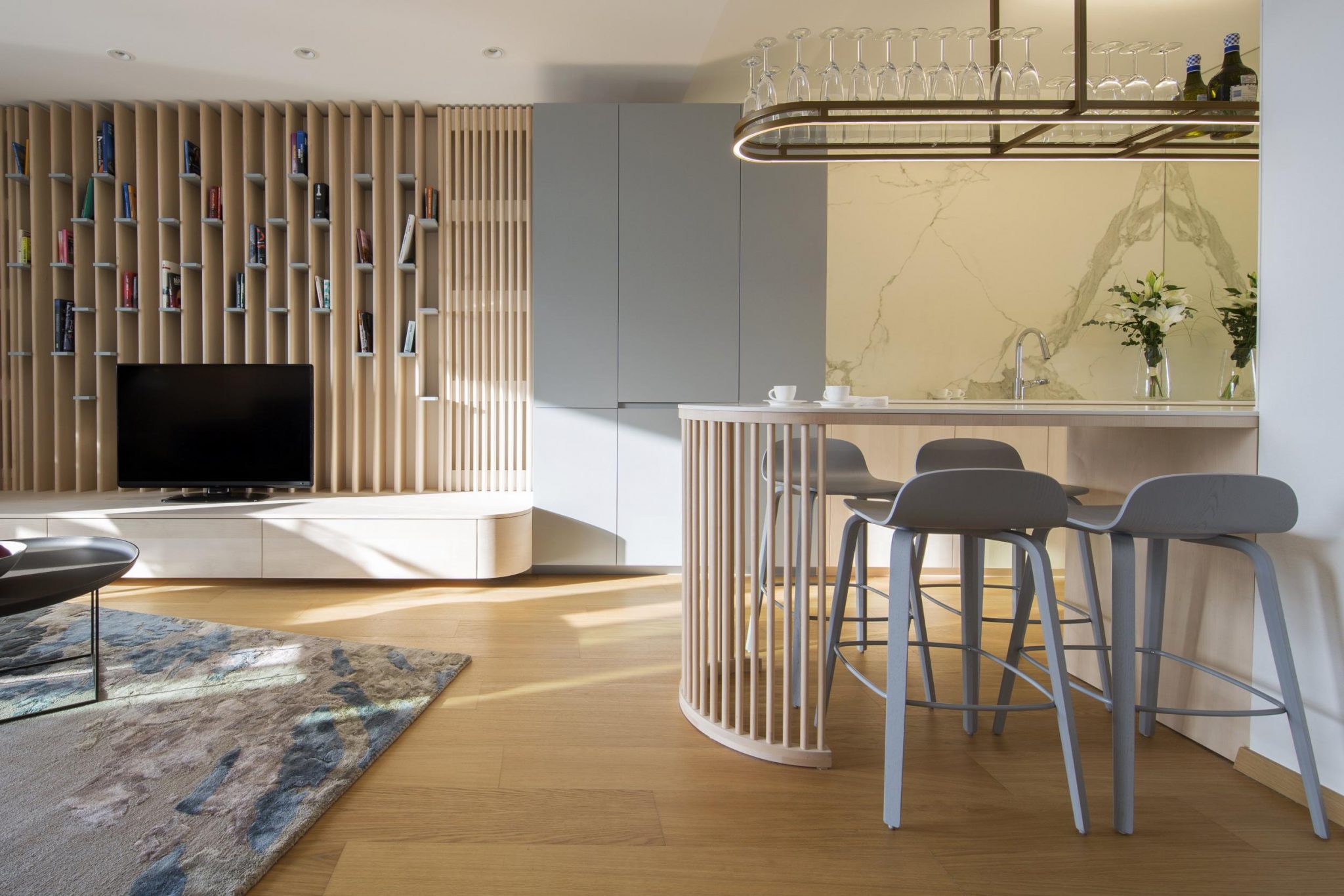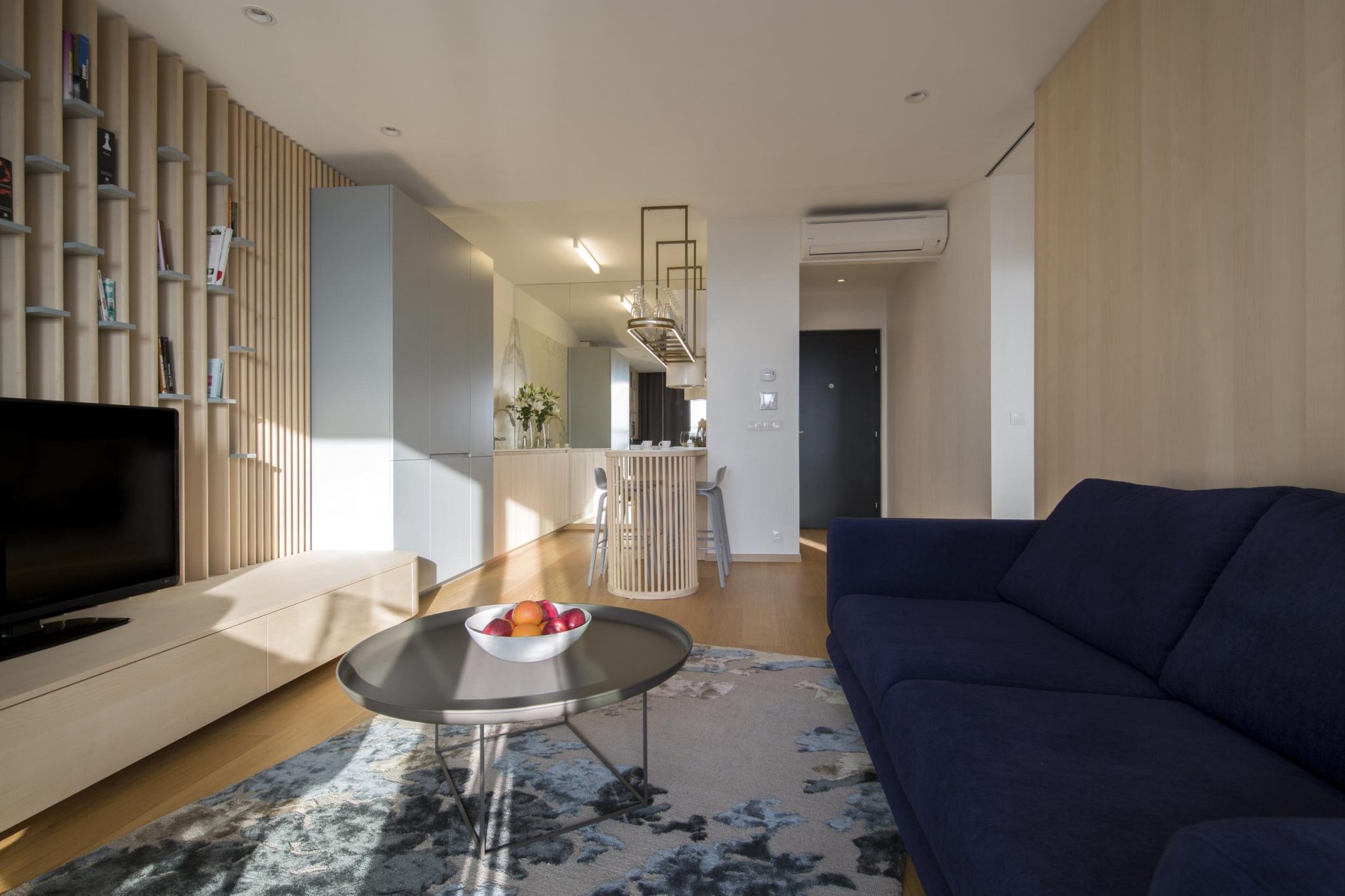 „Na odstránenie uniformity a zútulnenie dennej zóny sme použili overený recept, ktorým je drevo vo všetkých prevedeniach. Keďže sme byt prevzali s hotovou podlahou, drevo na nábytok sme vybrali s ohľadom na existujúce parkety. Zvolili sme brezu, ktorá je od dubovej podlahy svetlejšia a spolu tvoria príjemne prirodzený kontrast. Drevené časti nábytku sme navrhli so zaoblenými hranami, takže sú bezpečné aj pre deti,“ vysvetľujú architekti na svojom webe.