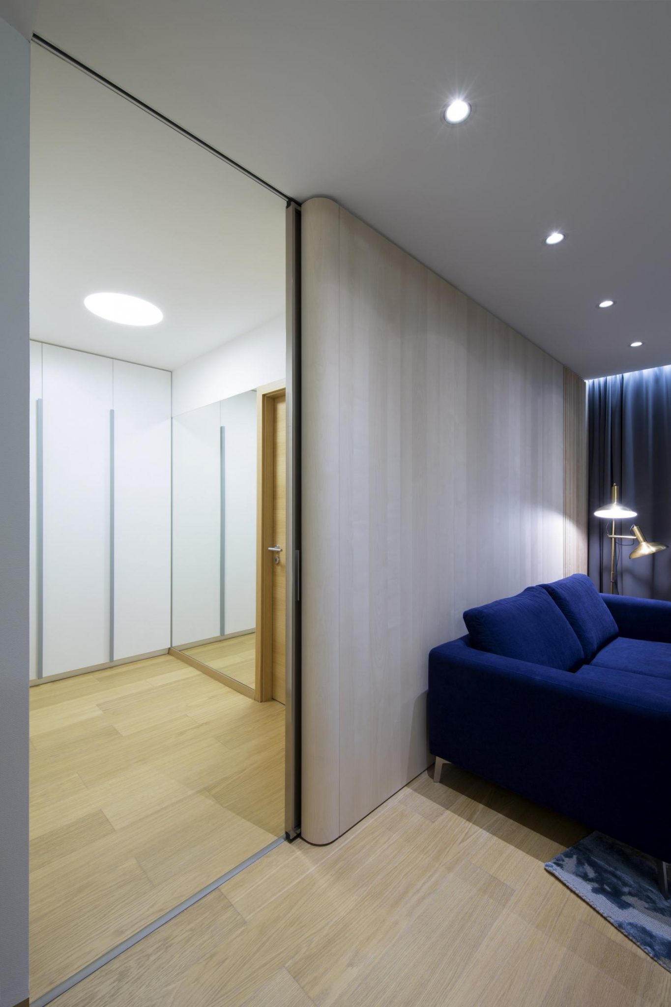 „Posuvné dvere so zlatým satinovaným sklom sme nechali vyrobiť na mieru v Taliansku špeciálne pre tento projekt. Dvere sa zasúvajú za zaoblený drevený obklad z brezovej dýhy, takže v otvorenom stave sú takmer neviditeľné. Z funkčného hľadiska oddeľujú denný priestor od nočnej chodby a napomáhajú k akustickému oddeleniu obývačky od spálne,“ dodávajú.