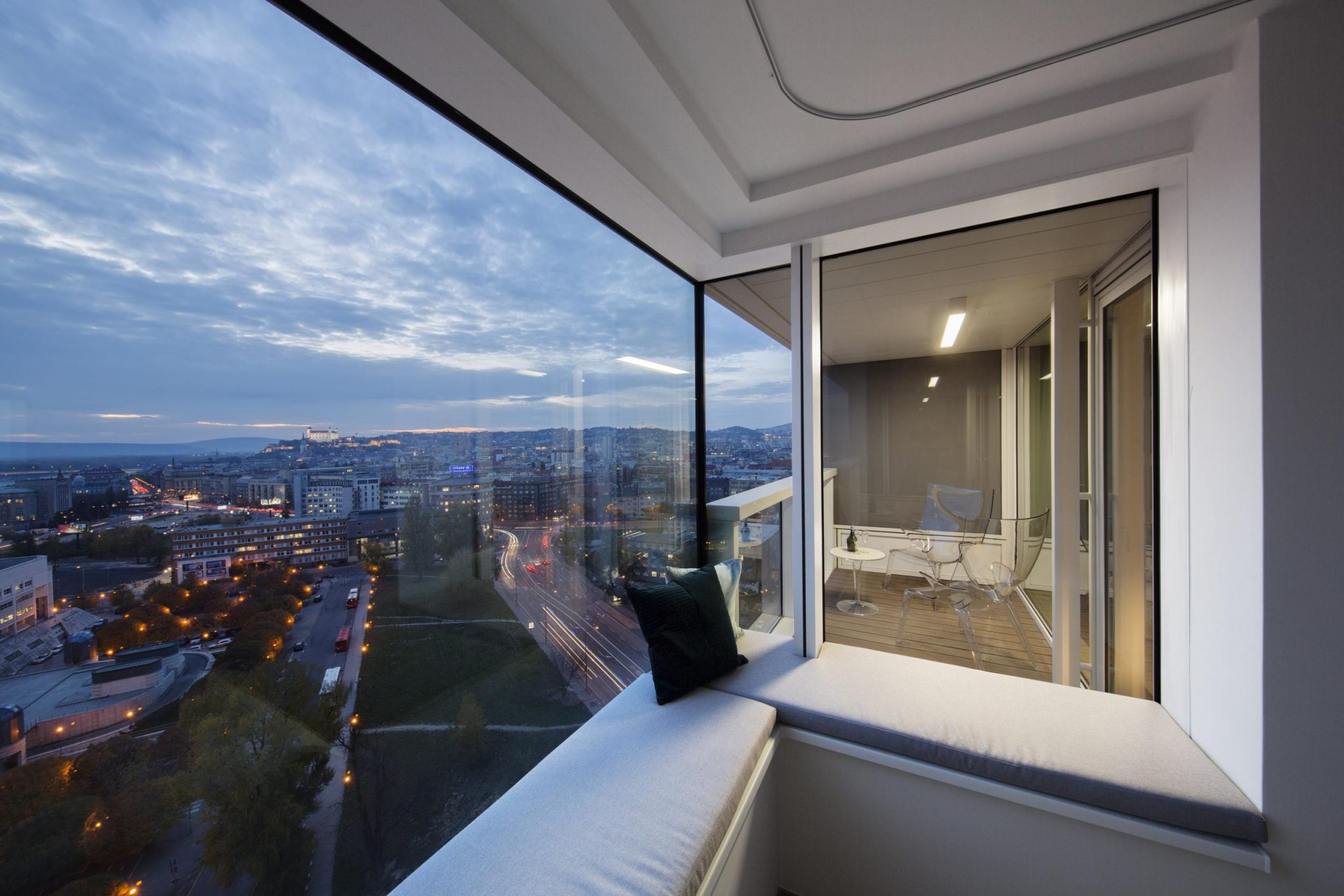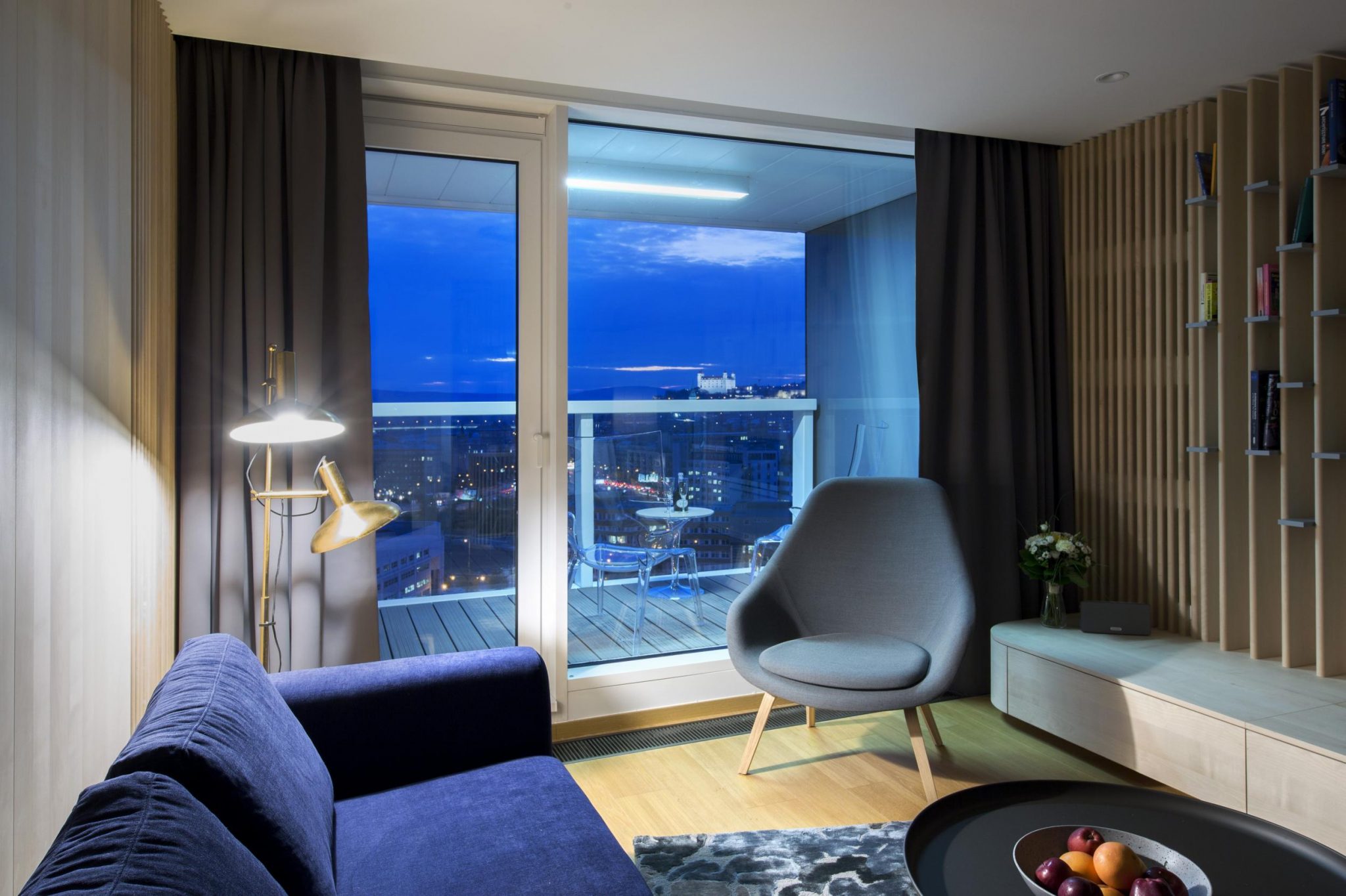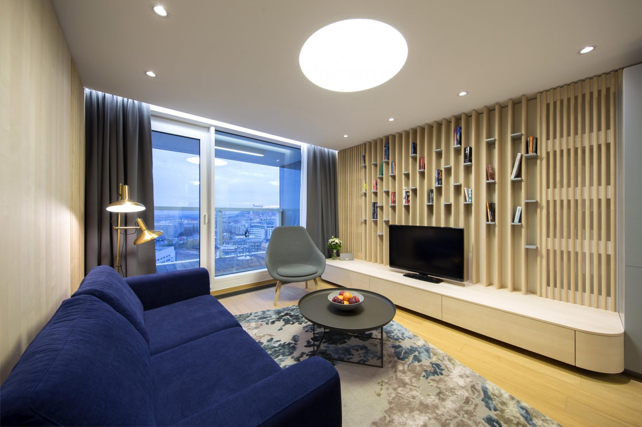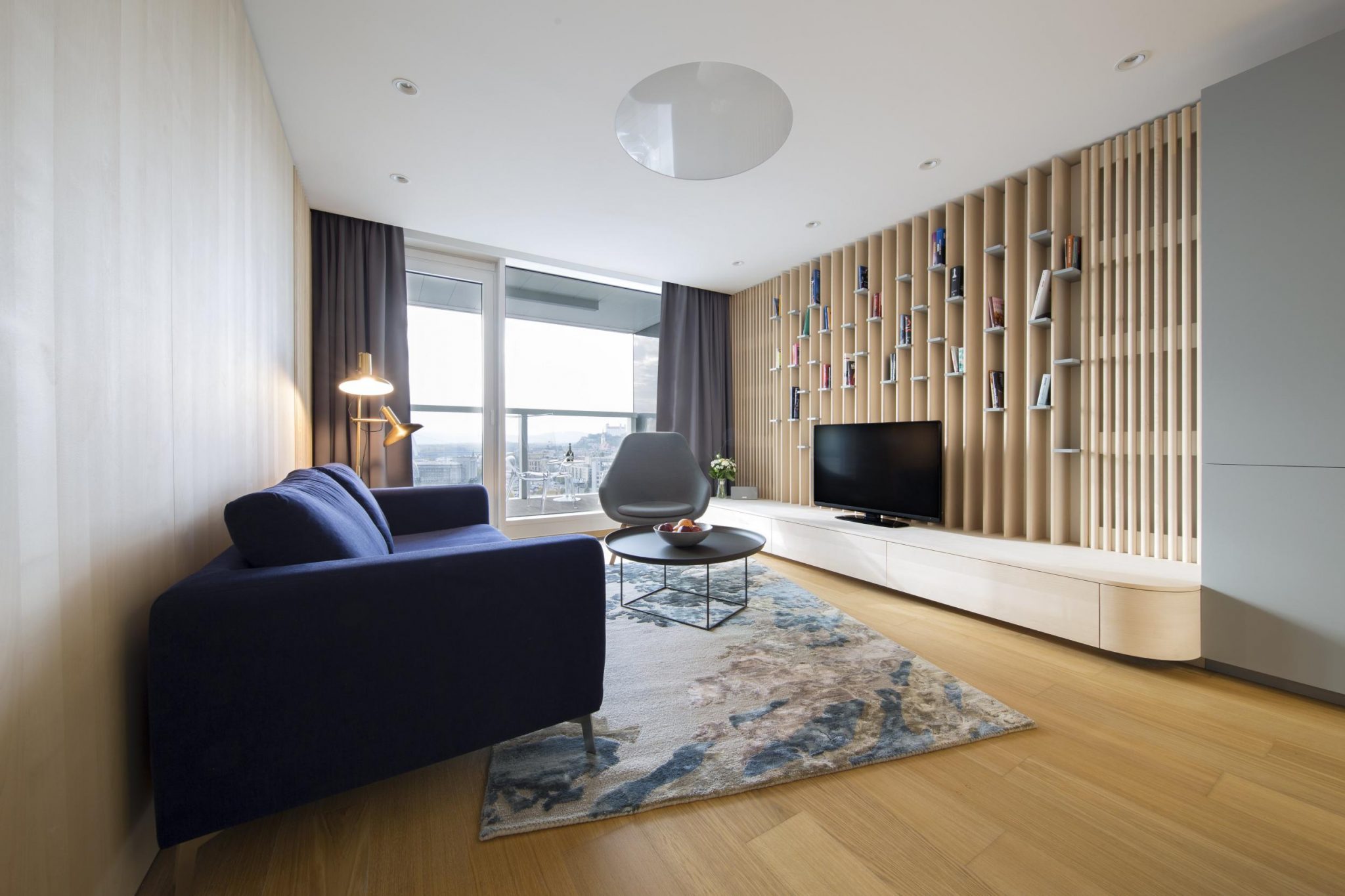 Pridanou hodnotou pre obyvateľov bytu v Panorama City je výhľad na Bratislavský hrad, ktorý si môžu dopriať priamo z obývacej izby. Dominantou bytu je lamelová stena za televízorom, z ktorej architekti urobili knižnicu a prekrýva tak radiátory, ktoré pôvodný vzhľad obývačky rušili.
