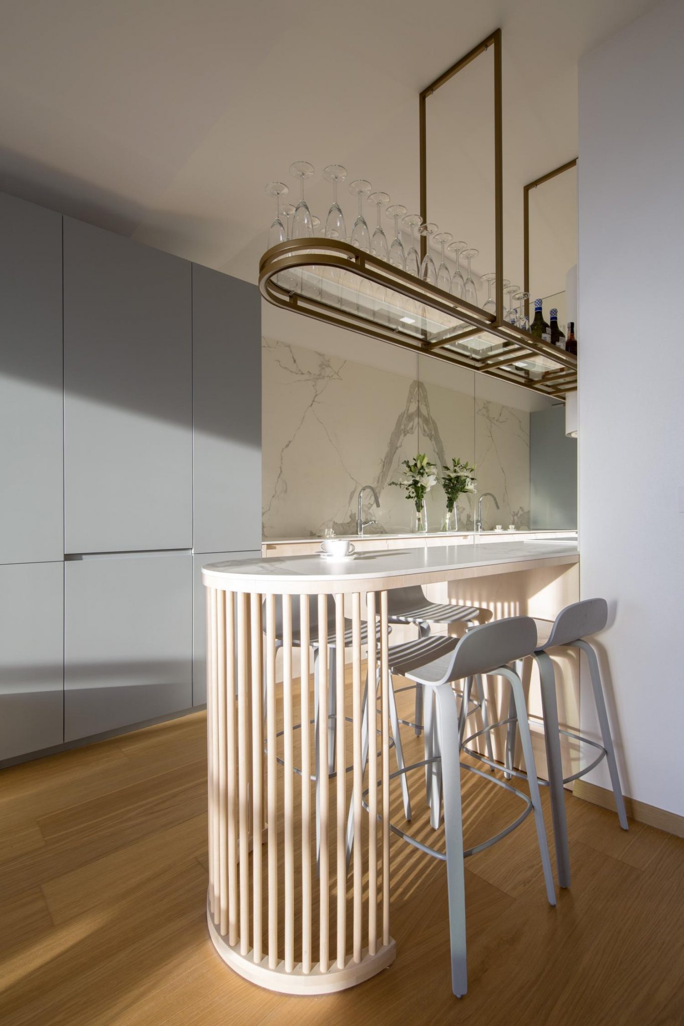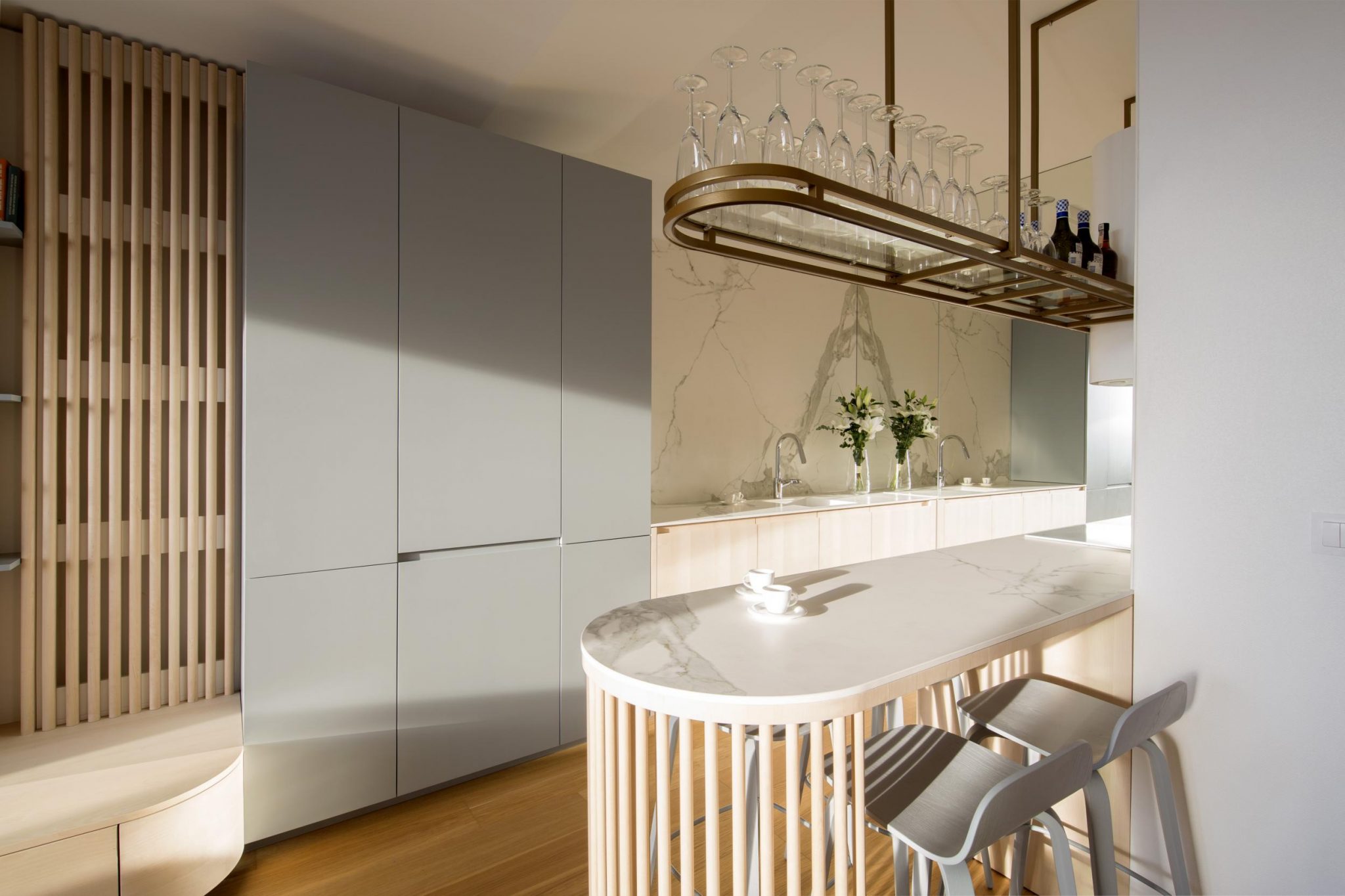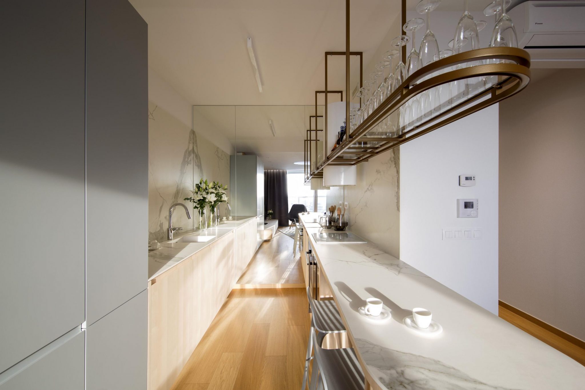 V kuchyni, v ktorej je okrem vstavaných spotrebičov vytvorené všetko na mieru očarí brezová dýha, tmavozlatý kov a odkladacia plocha na poháre.