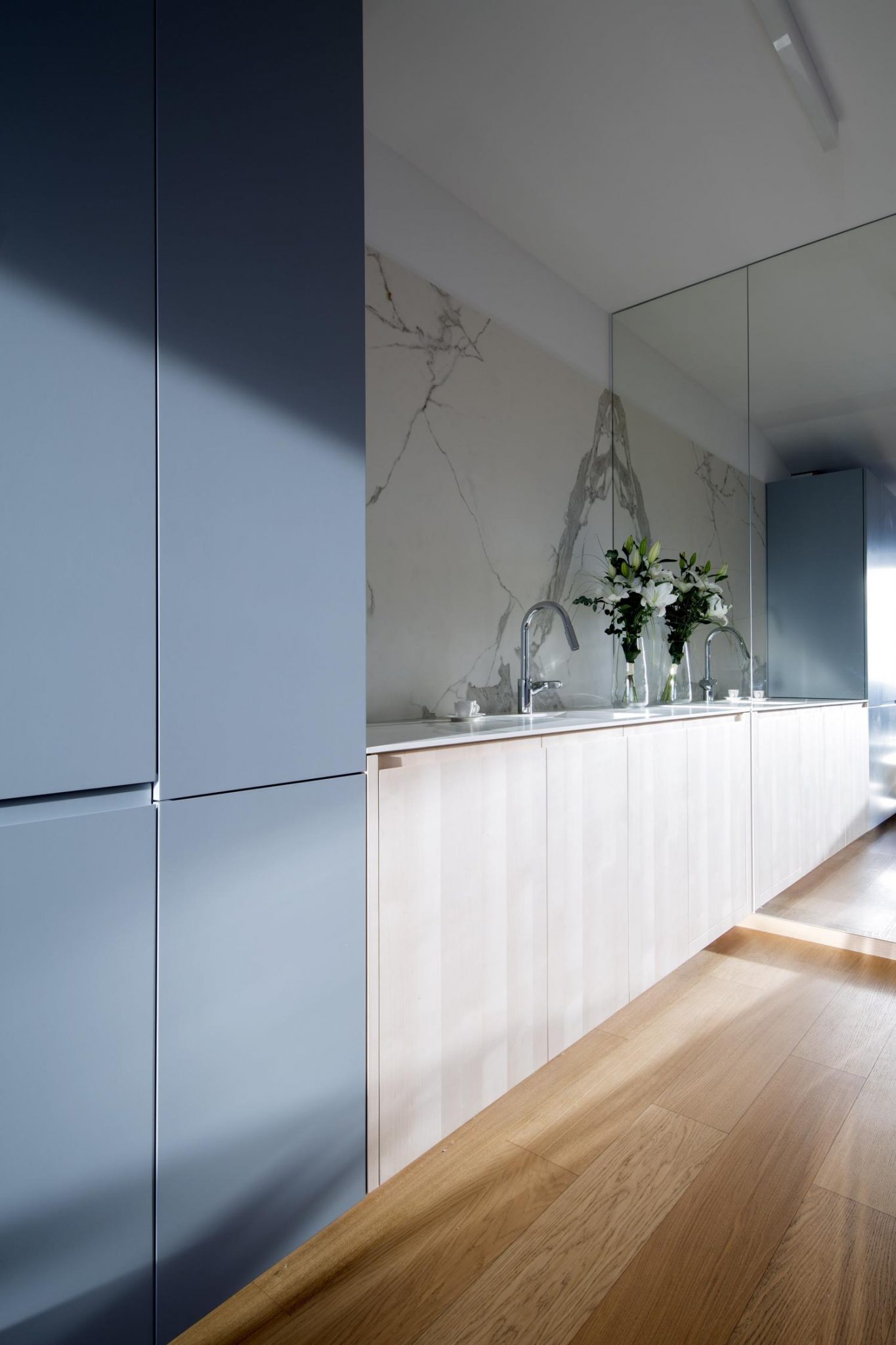 Architekti v tomto prípade dostali do rúk byt v novostavbe Panorama City, ktorá sa nachádza blízko Dunaja. Byt prevzali v štandarde, čo znamená, že mal zrealizované podlahy, dvere aj kúpeľnu. Rules architekti, ktorí stoja za finálnym vzhľadom bytu, stavili na zrkadlá, ktoré opticky rozšírili priestor, prírodné materiály a nadčasový dizajn.