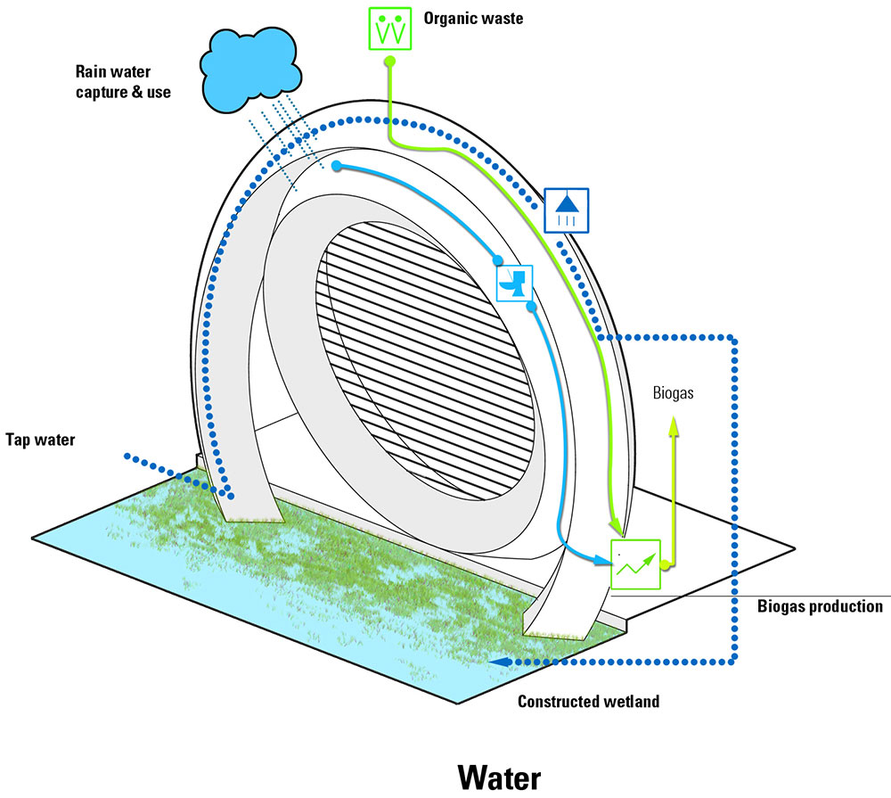 Windwheel je tiež vybavený solárnymi panelmi a jeho fasáda je navrhnutá tak, aby čo najlepšie využil prírodné zdroje. Používanie vody v budove je starostlivo riadené, dažďová voda sa zachytáva na vrchu budovy a voda z vodovodu je vypúšťaná do mokradí, ktoré obkolesujú budovu. Odpad obyvateľov je využitý na výrobu bioplynu.