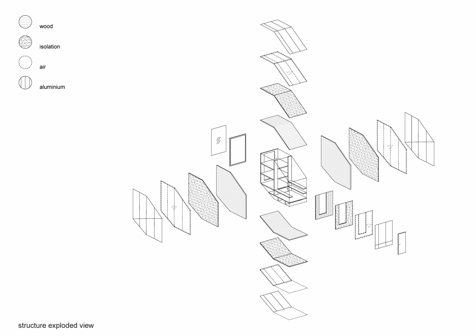 Vykonzolovaná drevená konštrukcia má vonkajší rozmer 2,4 x 4,9 metra. Na ploche 9,7 m² chata poskytuje miesto na prenocovanie deviatim turistom. Spí sa na spoločných platformách v troch úrovniach. Veľké čelné zasklenie otvára výhľad do údolia a malý priestor tak nepôsobí stiesnene. Interiér je riešený čisto s ohľadom na funkciu, všetky povrchy sú zo smrekovej preglejky. Štíhly profil a vykonzolovanie zabezpečuje funkčnosť aj v prípade veľkej vrstvy snehu a minimalizuje styk objektu s terénom. Stavbu je po prekročení plánovanej životnosti možné odstrániť s minimálnym dopadom na okolitú prírodu.