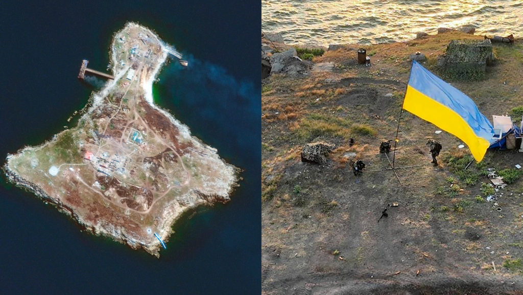 Toto ukrajinské územie patriace do Odeskej oblasti sa preslávilo hneď na začiatku ruskej invázie vlani vo februári. Vtedy ruskí dôstojníci na vojnovej lodi Moskva, pýche Čiernomorskej flotily, cez vysielačku vyzývali ukrajinských vojakov, ktorí tam boli umiestnení, aby sa vzdali – inak ich zabijú.