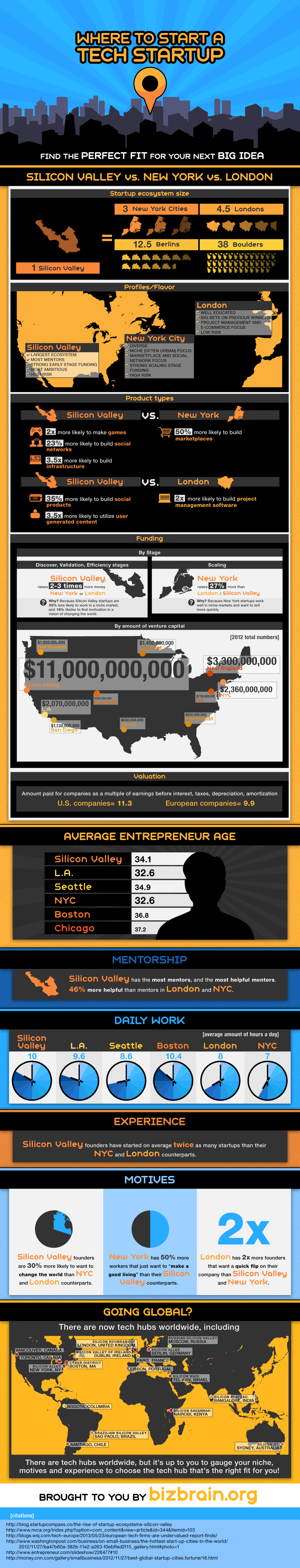 Nikto nepochybuje o tom, že ak by sme sa spýtali kohokoľvek „Čo je centrom sveta startupov?“, odpoveď by vždy znela „Silicon Valley“. Ale prečo? Nasledujúca infografika porovnáva práve túto lokalitu s (prevažne) Londýnom a New Yorkom. Zároveň dáva odpoveď na to, prečo Mekkou startupov nie sú práve tieto dve mestá.