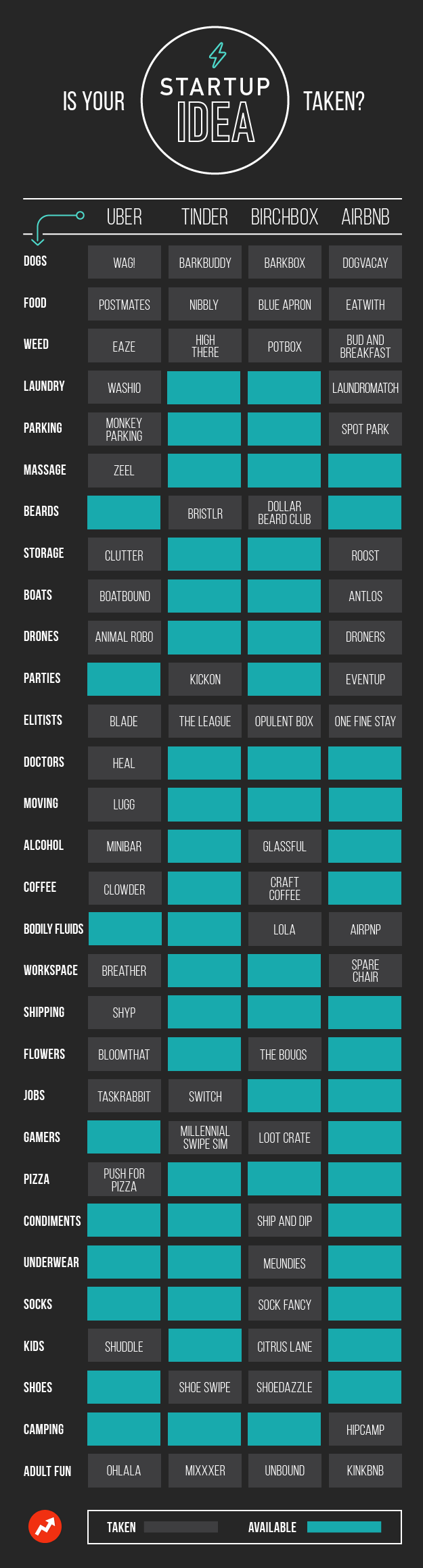 V tomto zozname nájdeš, ktoré nápady na Uber, Tinder, Birchbox alebo Airbnb rôznych odvetví ešte môžeš skúsiť, a s ktorými ťa už niekto predbehol. Vypichol by som napríklad Tinder pre ponožky, alebo Airbnb pre pizzu.