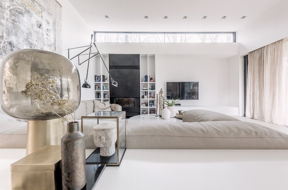 Strohá geometria s pravouhlými líniami nábytku a biele priestorové štruktúry prebiehajúce interiérom zjednocujú obytný priestor domu. Súčasne tiež umožňujú vytvoriť čisté odkladacie priestory pre predmety každodennej potreby.