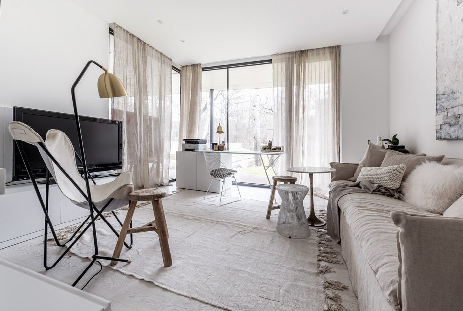 Biela farba je použitá v mnohých odtieňoch a štruktúrach na drevených olejovaných podlahách, na hrubo brúsenom dubovom nábytku alebo bielom mramorovom obklade. Prechádza aj do textilu – biely ľan na obliečkach a závesoch. To všetko v kombinácii s detailmi z masívneho dreva.