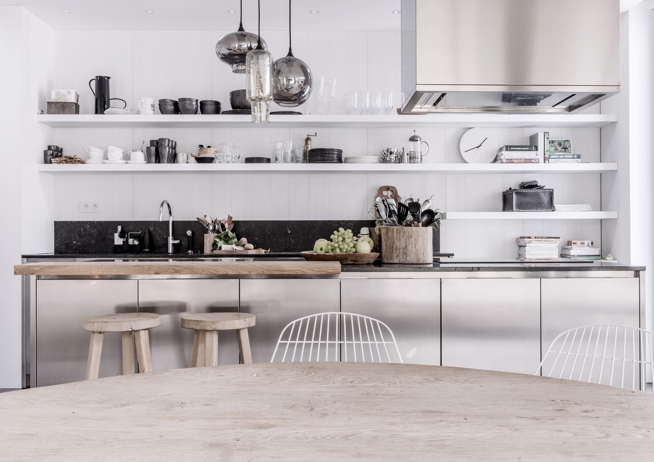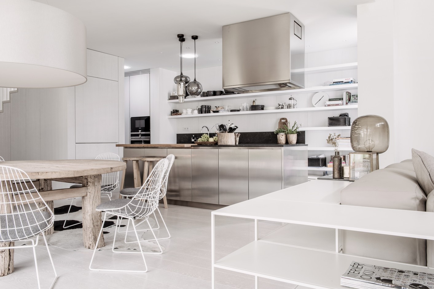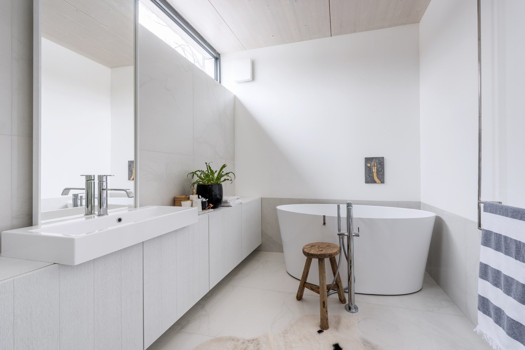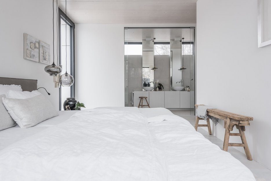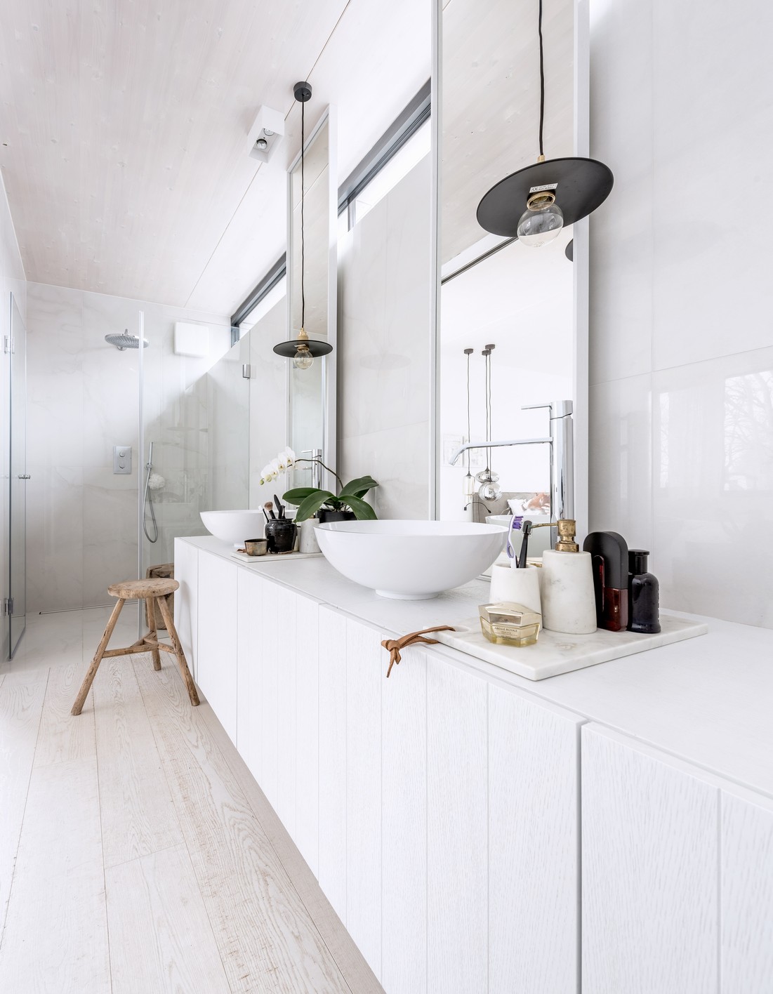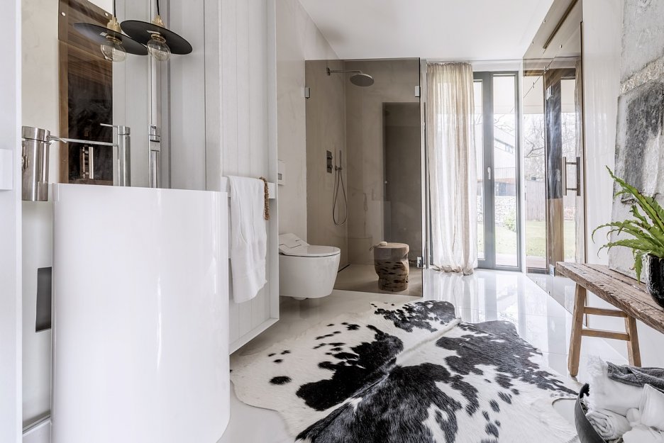 Biela farba je použitá v mnohých odtieňoch a štruktúrach na drevených olejovaných podlahách, na hrubo brúsenom dubovom nábytku alebo bielom mramorovom obklade. Prechádza aj do textilu – biely ľan na obliečkach a závesoch. To všetko v kombinácii s detailmi z masívneho dreva.