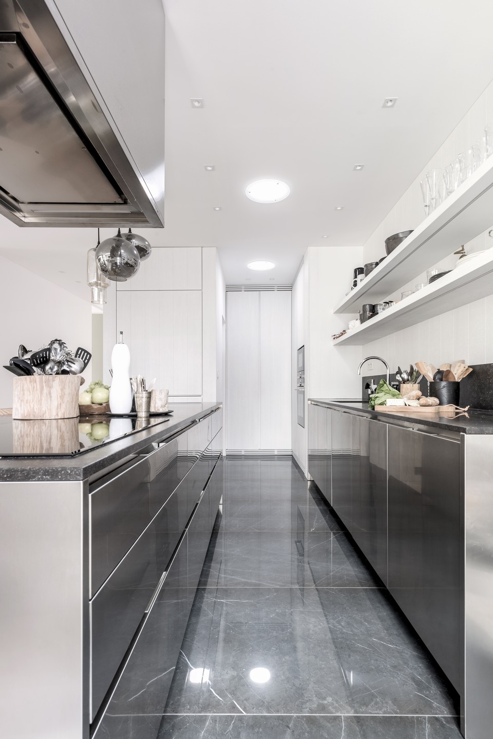 Strohá geometria s pravouhlými líniami nábytku a biele priestorové štruktúry prebiehajúce interiérom zjednocujú obytný priestor domu. Súčasne tiež umožňujú vytvoriť čisté odkladacie priestory pre predmety každodennej potreby.