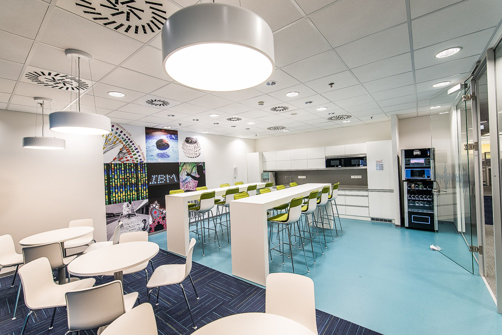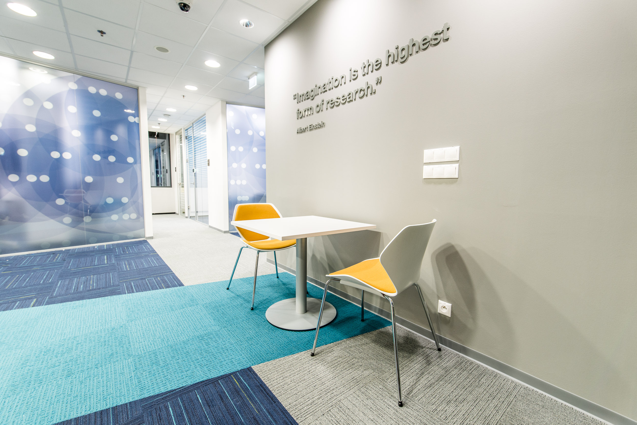 J.S: Pozorovali sme zaujímavé tendencie vo fungovaní firmy, najmä v oblasti vnútornej komunikácie, ale aj komunikácie s klientom. V roku 2010 bolo potrebné eliminovať hluk z telefonovania vo veľkopriestorovej kancelárii, preto sa robili malé miestnosti na telefonovanie. Telefónne miestnosti sa osvedčili a navrhujeme ich aj v súčasnosti, kedy sa využívajú aj na krátkodobú sústredenú prácu. Dnes sa orientujeme viac na spoločné priestory, kde môžu ľudia komunikovať „face to face“, kedy sa problémy riešia efektívnejšie. Namiesto uzavretých zasadačiek, sa do kancelárií dostávajú menšie neformálne priestory na rýchle stretnutia. Ďalšou oblasťou je komunikácia na diaľku prostredníctvom videokonferencií a digitálne prezentácie. Projektory a plátna nahrádzajú veľkoformátové LCD obrazovky s kamerami a mikrofónmi. Veľký dôraz je preto kladený na dobrú akustiku priestorov.