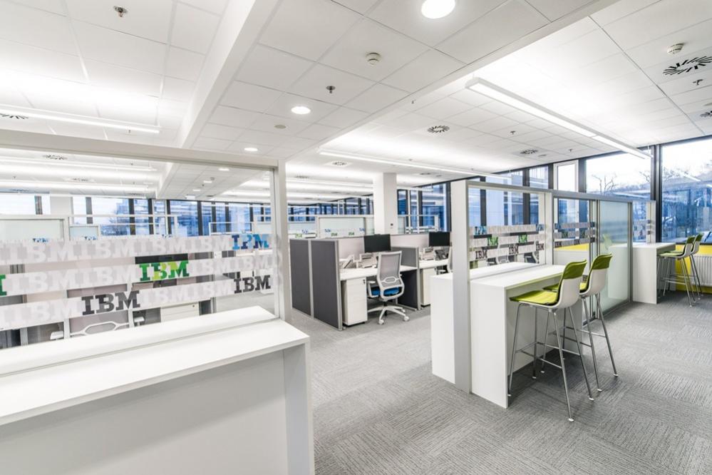 Priestor je na 1.NP a je riešený prevažne ako „open space“. Pozdĺž fasády sú umiestnené pracovné miesta, oddelené akustickými paravanmi a posuvnými popisovateľnými zasklenými priečkami do výšky 1,8m. Tieto priečky slúžia na komunikáciu s klientom. Zasadacie miestnosti, tiché miestnosti na sústredenú prácu, oddychová zóna a kuchynka sú od ostatného priestoru oddelené celopresklenými akustickými priečkami. Spoločnosť IBM, ktorá je jedným z lídrov v oblasti IT technológií, kládla zvýšenú pozornosť aj na vybavenie zasadacích miestností kvalitnou audiovizuálnou technikou. Na stenách zasadacích miestností boli použité celoplošné akusticky pohltivé obklady. Rovnako aj podhľady sú v celom priestore akustické. Farebnosť a použité materiály boli navrhnuté v súlade s firemnou kultúrou. Snahou bolo vytvoriť svetlý, vzdušný a moderný interiér.