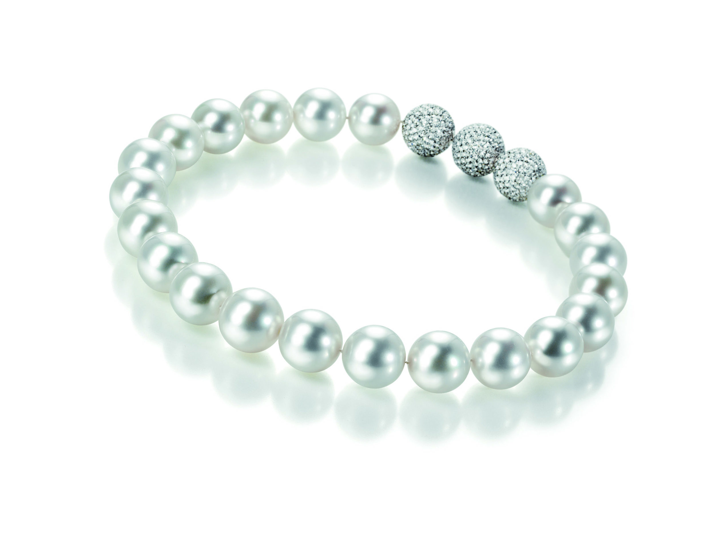 Pridanú hodnotu a sofistikovanosť úchvatným kultivovaným perlám dodávajú tri guličky obsahujúce 630 trblietavých briliantov najvyššej kvality s celkovou hmotnosťou viac ako 20 karátov.