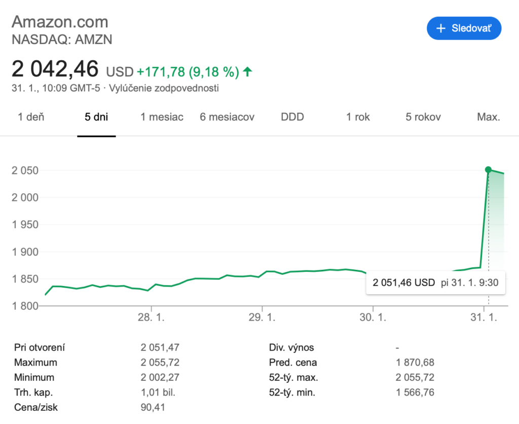 - Akcie spoločnosti Amazon prudko vzrástli o približne 12% na 2 100 dolárov
