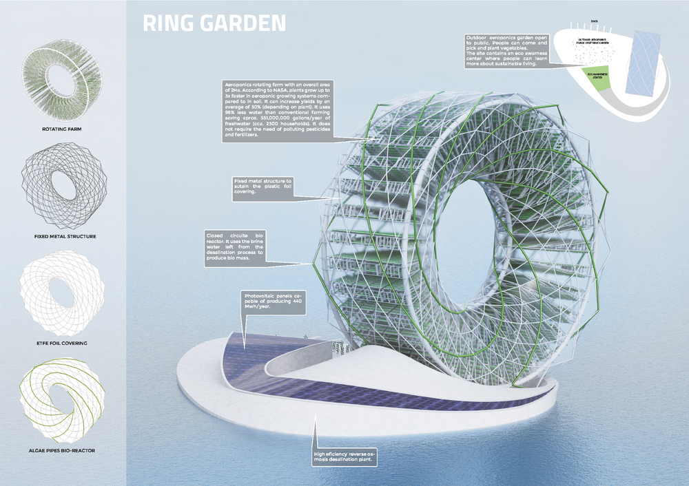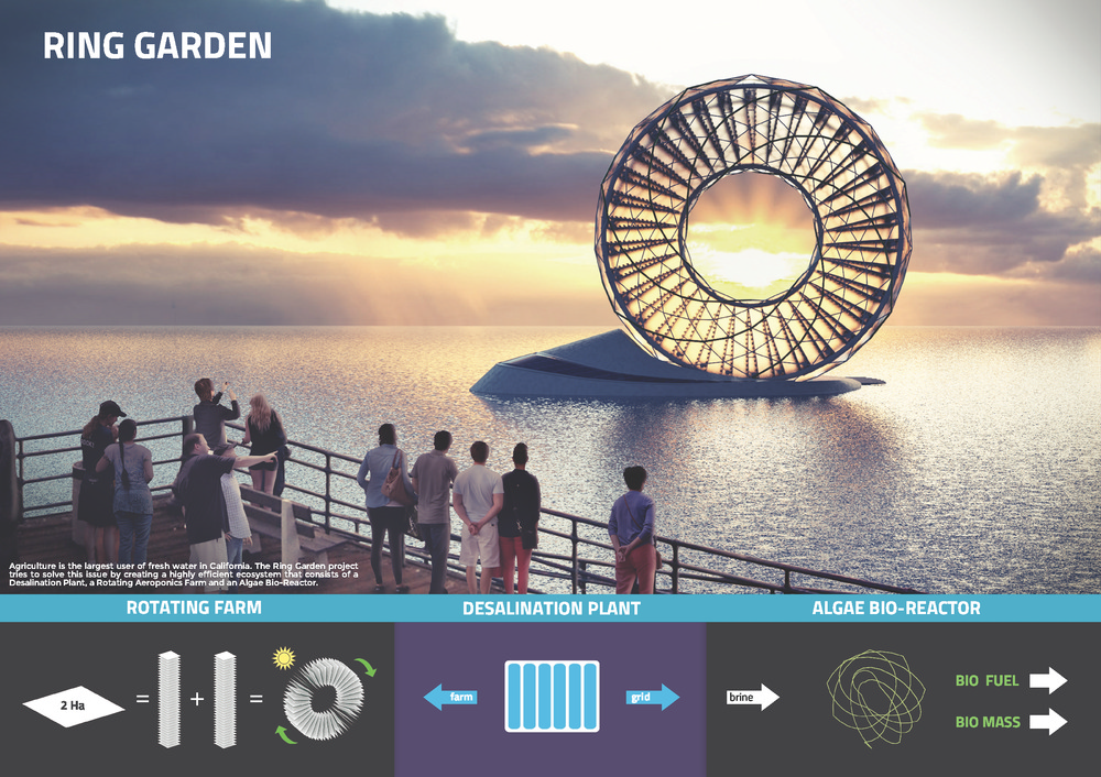 - Poľnohospodárstvo je najväčším spotrebiteľom vody v Kalifornii. Projekt s názvom Ring Garden sa pokúša tento problém vyriešiť návrhom vysoko efektívneho ekosystému, ktorý pozostáva z rastliny, ktorá zbavuje vodu soli, rotujúcej sa farmy a malého bio reaktora z rias. Zariadenie využíva morskú vodu, CO2 a solárnu energiu na produkciu čistej vody, biomasy a drobných čerstvých plodín.