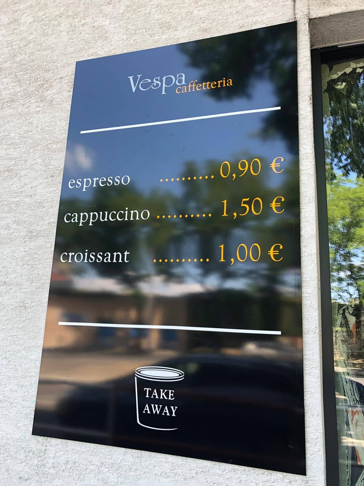 Hudba, zvuk cinkajúceho riadu a buchot lattiéry o pult. Podnosy a mliečne kávy a taký ten usporiadaný chaos, kde každý vie, čo má robiť. Marketingový ťah však premysleli dokonale. V kaviarni sa cítiš ako v malej dediny neďaleko Pisy, kde začali vyrábať skútre v roku 1964. Na stenách visia staré fotky fúzatých Talianov na starých Vespách. Idylka.