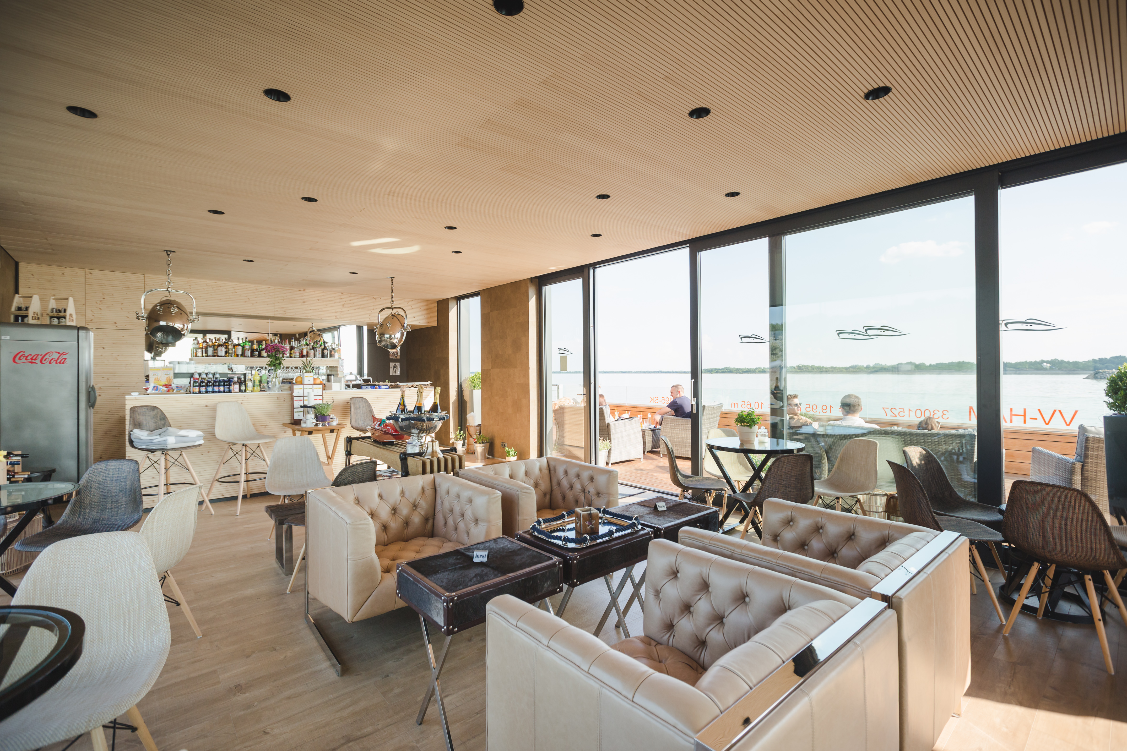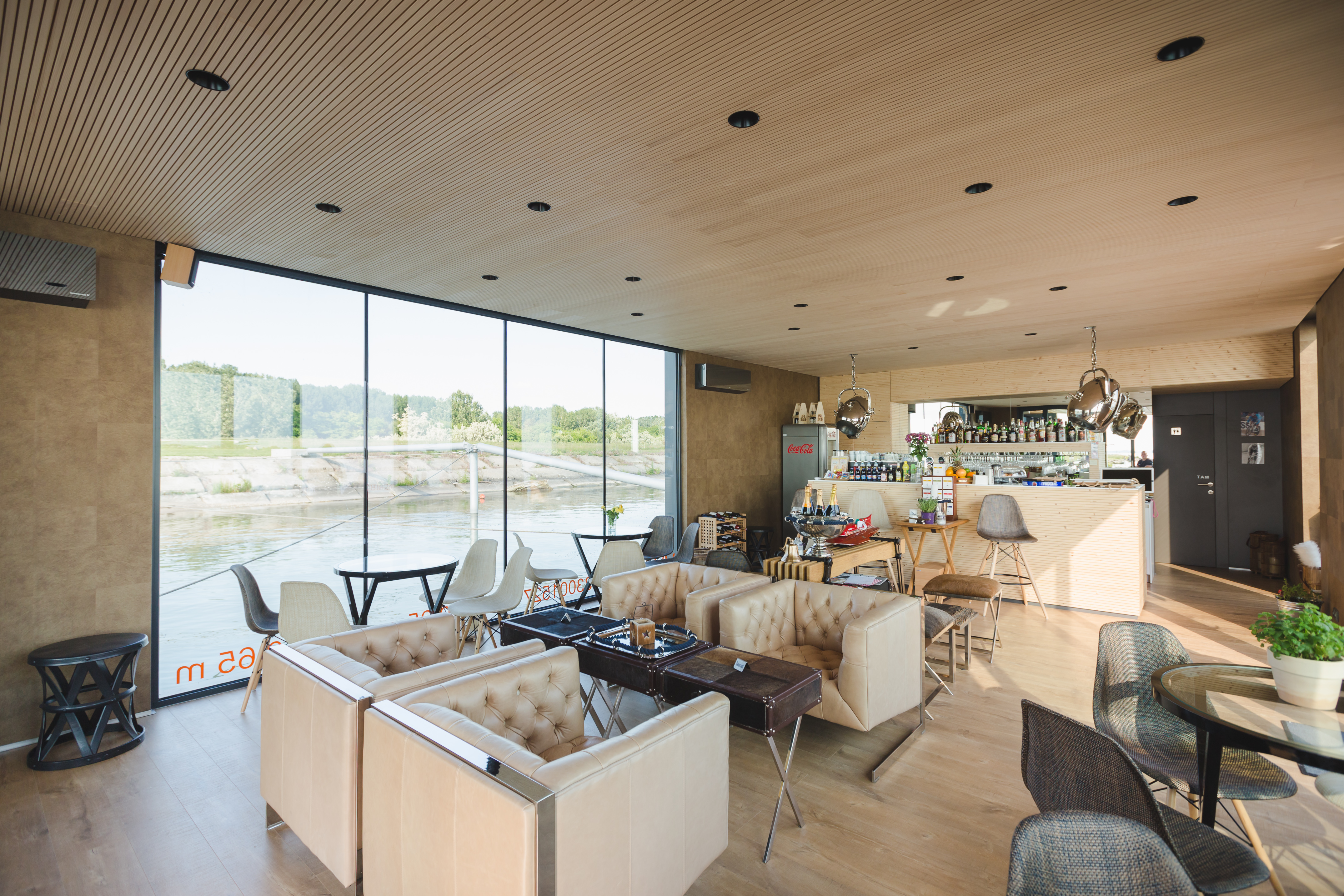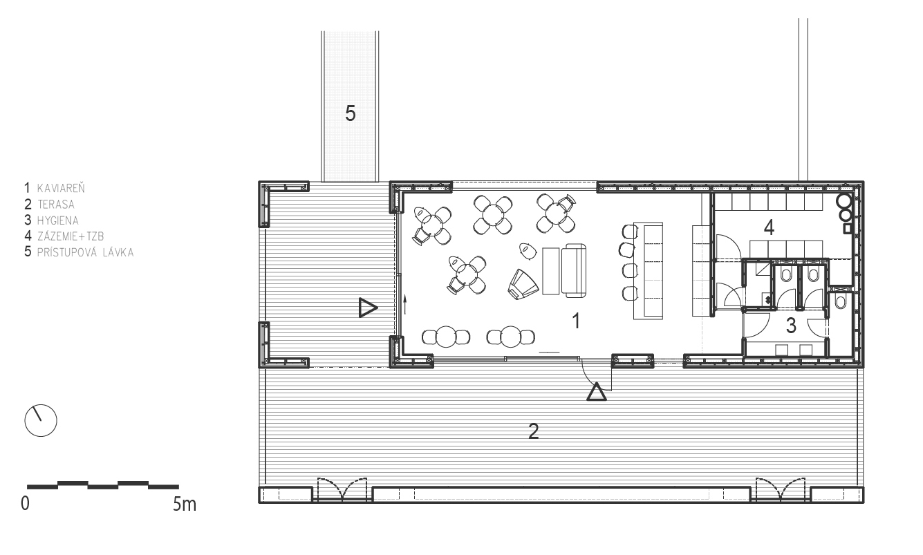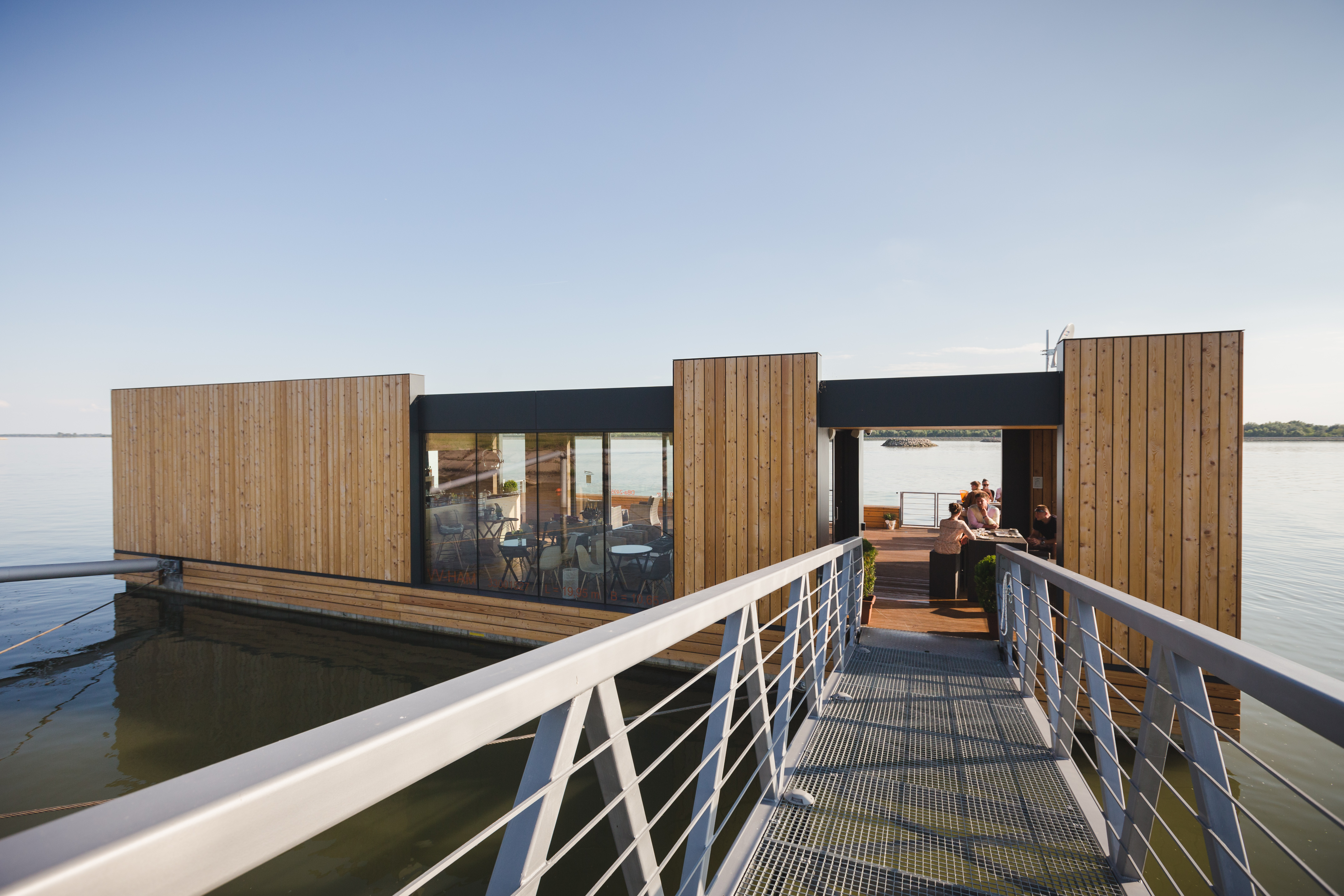 Po mostíku vstupujeme na palubu plavidla na pravoboku. Vstup do nadstavby je situovaný na návodnej strane hlavnej paluby. Vstupujeme do priestoru kaviarne, ktorá predstavuje najväčšiu časť objektu. Tento priestor je z troch strán presklený a je tu umiestnené sedenie. Na priestor kaviarne smerom na kormu plavidla nadväzuje zázemie. Zázemie predstavuje technická miestnosť vybavená technológiami potrebnými pre fungovanie objektu, skladový a úložný priestor a toalety.