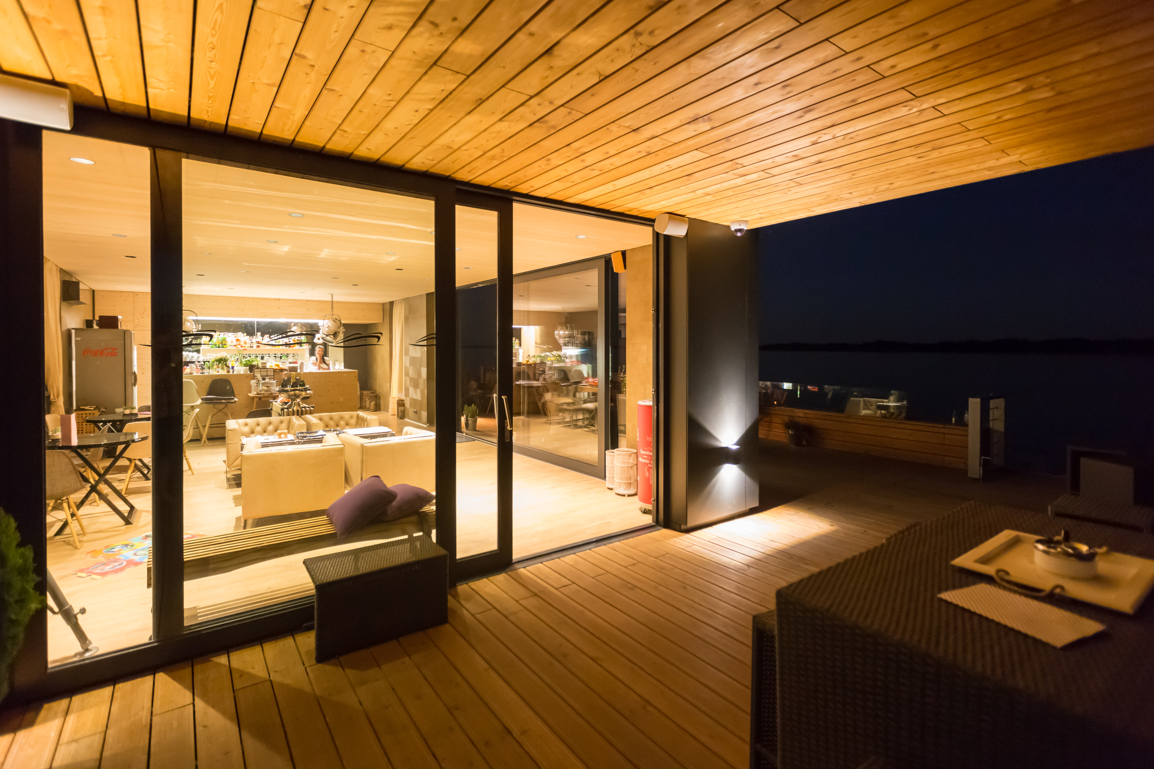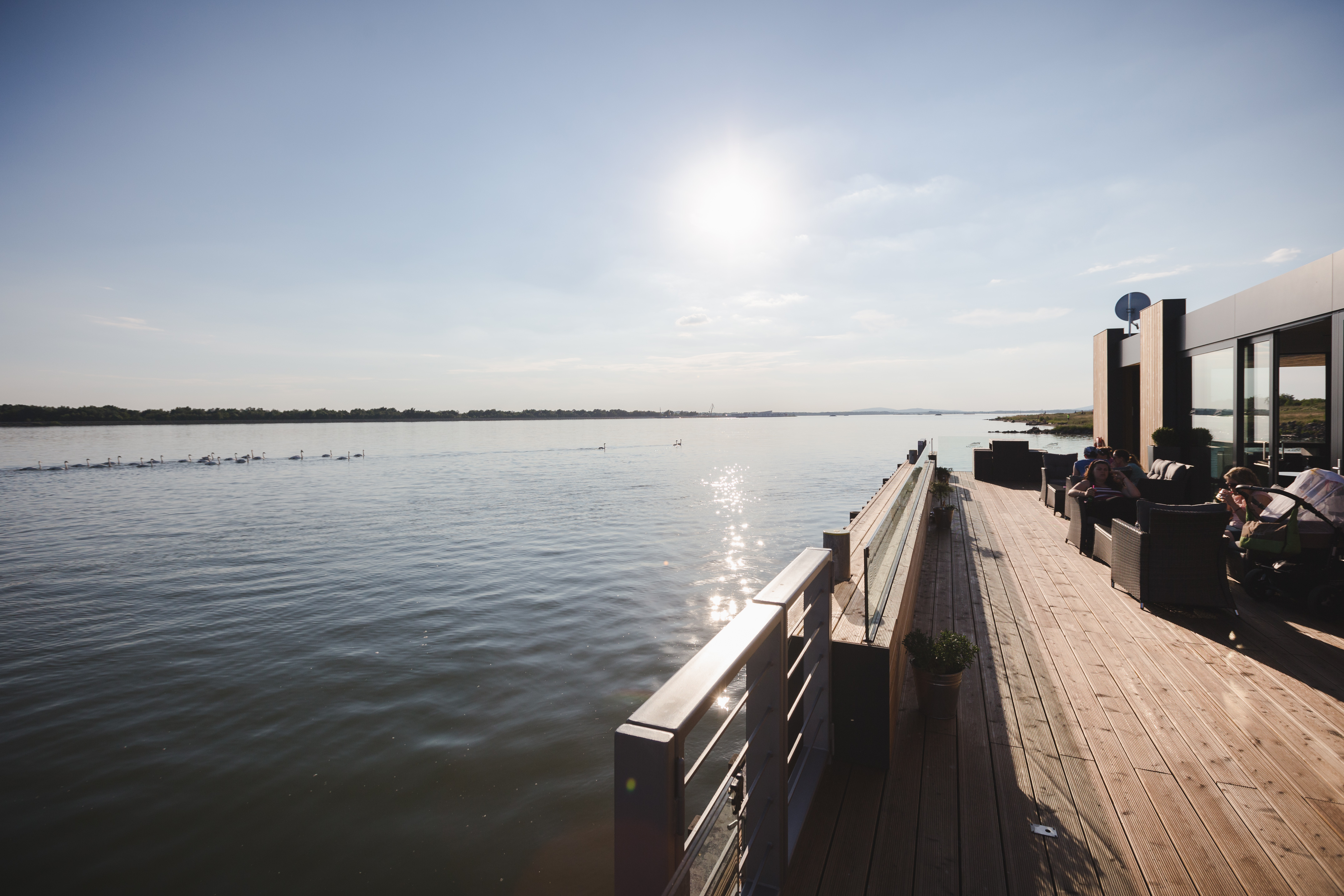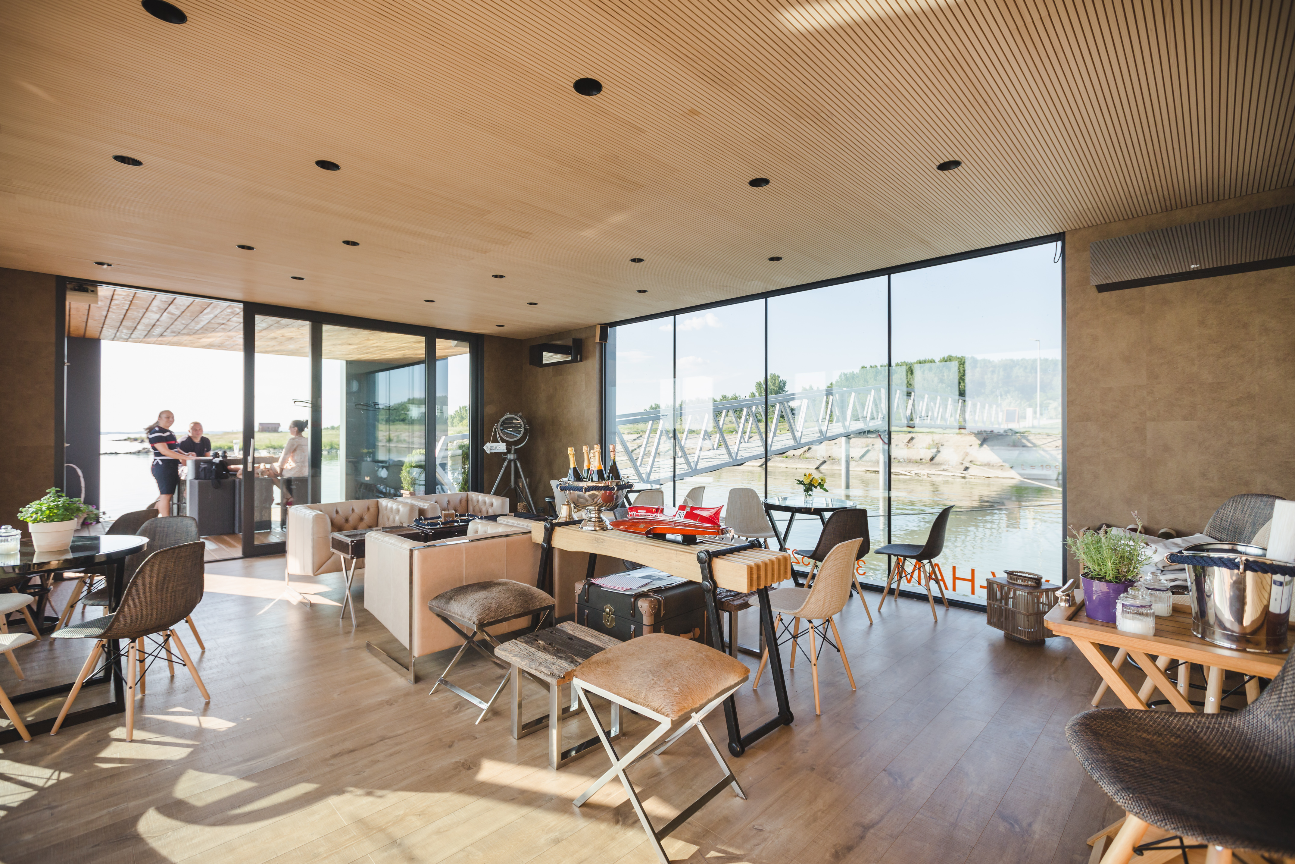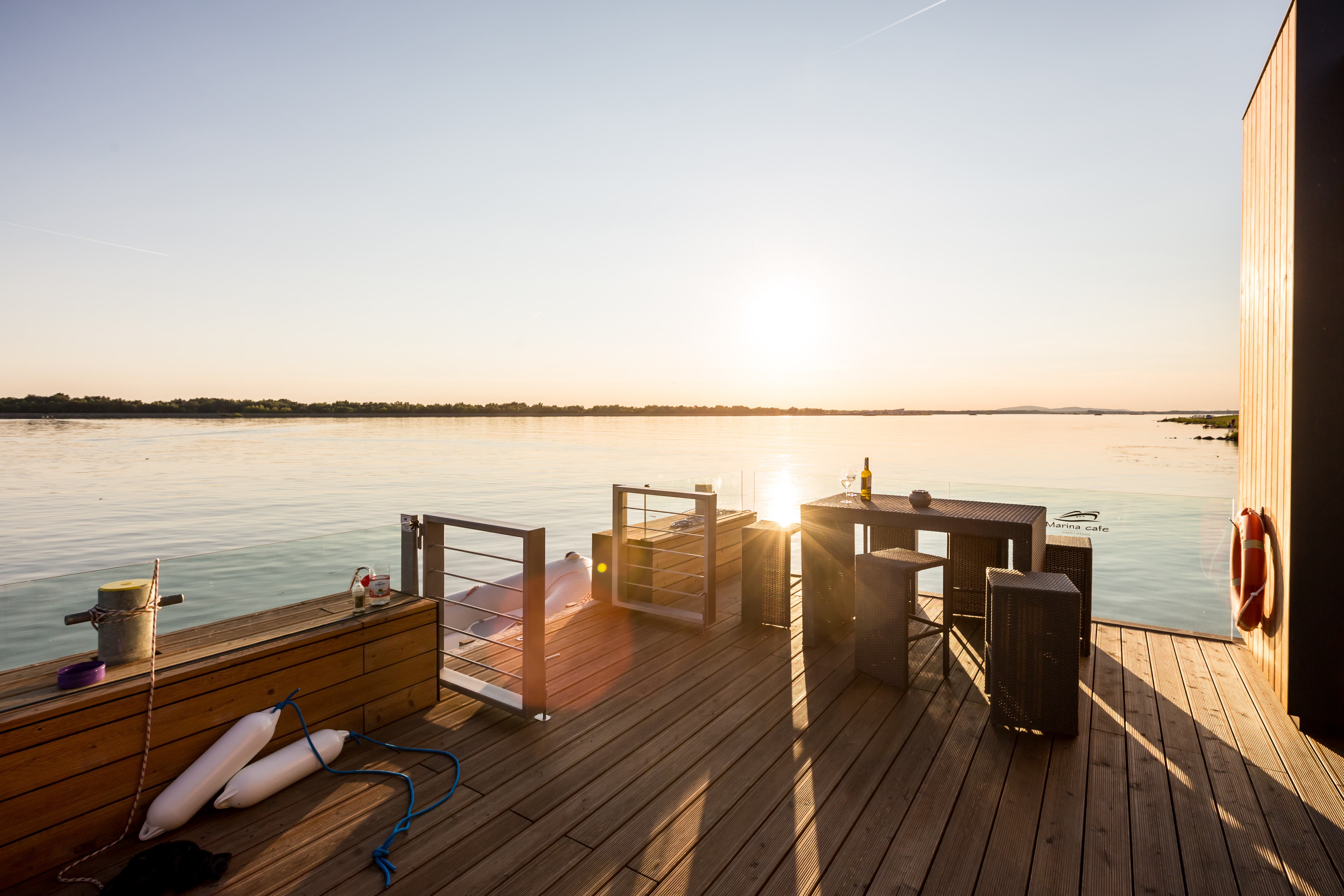 Po mostíku vstupujeme na palubu plavidla na pravoboku. Vstup do nadstavby je situovaný na návodnej strane hlavnej paluby. Vstupujeme do priestoru kaviarne, ktorá predstavuje najväčšiu časť objektu. Tento priestor je z troch strán presklený a je tu umiestnené sedenie. Na priestor kaviarne smerom na kormu plavidla nadväzuje zázemie. Zázemie predstavuje technická miestnosť vybavená technológiami potrebnými pre fungovanie objektu, skladový a úložný priestor a toalety.