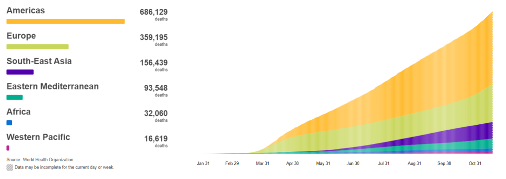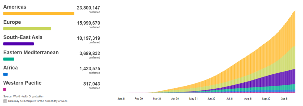Podľa údajov WHO doteraz bolo potvrdených takmer 56 miliónov prípadov koronavírusu na celom svete. Ochoreniu podľahlo 1 344 003 ľudí. V Európe bolo zaznamenaných takmer 16 miliónov prípadov a 356 195 úmrtí. WHO podľa BBC uviedlo, že na kontinente sa vyskytlo 28 % zo všetkých prípadov nákazy a 26 % zo všetkých úmrtí.