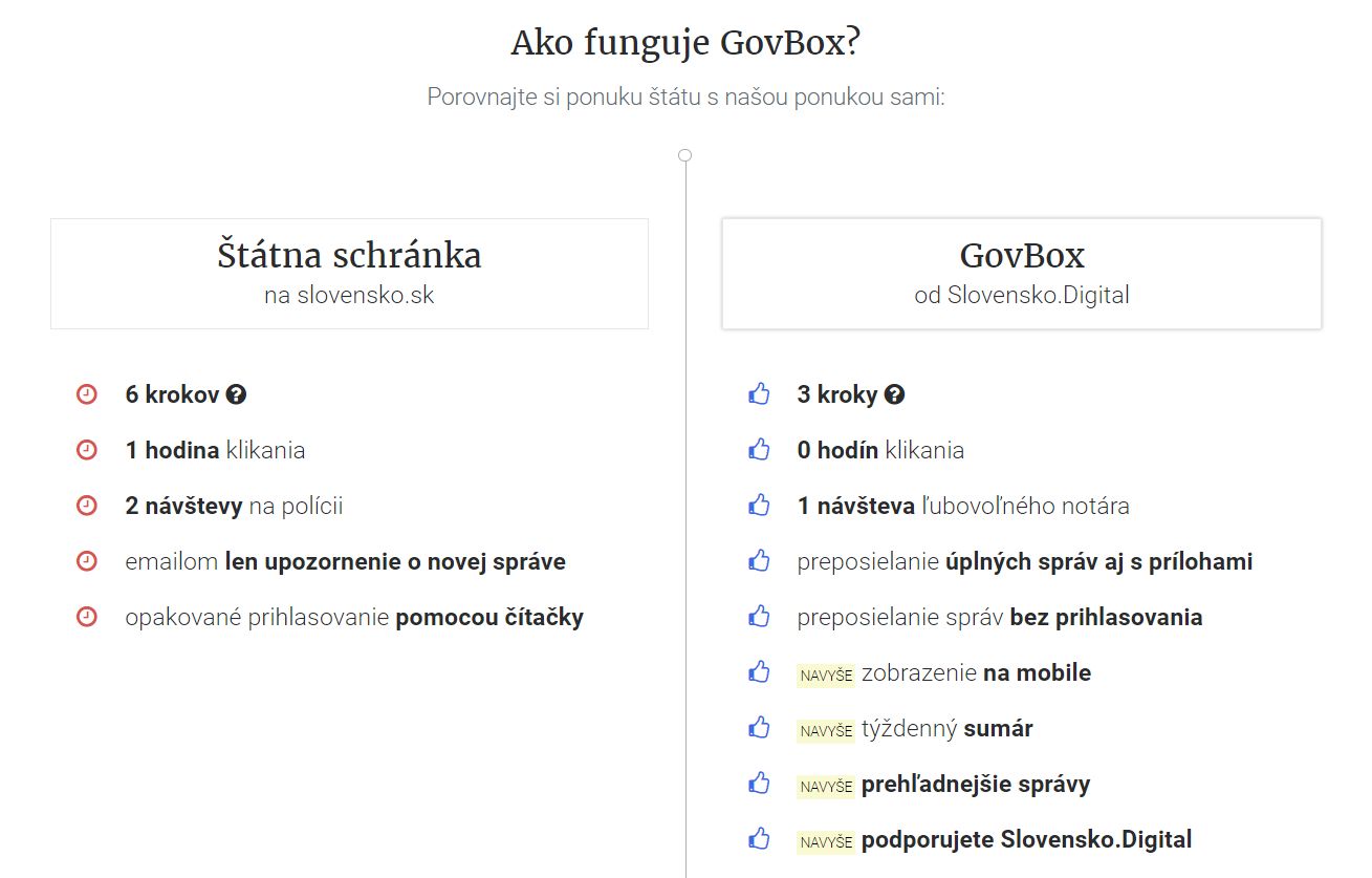 V službe Slovensko.Digital nazvanej GovBox aj vo svojej schránke Zelenej pošty môžeš prijímať poštu doručenú štátom do e-schránky bez toho, aby si potreboval absolvovať vyššie spomenuté martýrium. Všetky dokumenty ti prídu jednoducho do tvojej emailovej schránky, tak ako sa na 21. storočie patrí. Nepotrebuješ si vybavovať občiansky či nosiť so sebou čítačku. Nutná je len návšteva u notára, pred ktorým podpíšeš splnomocnenie, aby jedna z týchto inštitúcií mohla spravovať tvoju e-schránku.