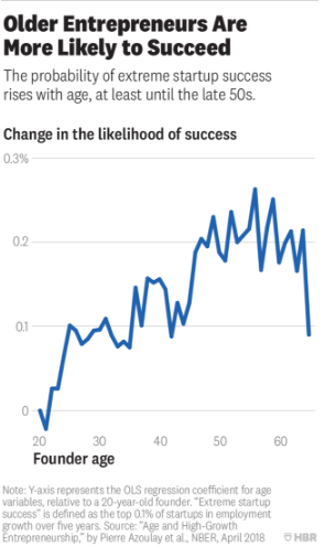 Zaujímavým faktom je, že ak sa podrobne pozrieme na podnikateľov, ktorí začínali už v mladom veku ako sú Steve Jobs, Bill Gates, Jeff Bezos či Sergey Brin a Larry Page, najvyšší zisk zaznamenali až v strednom veku. Zoberme si napríklad Steve Jobsa, svoj najúspešnejší produkt, iPhone, predstavil v roku 2007, vtedy mal už 52 rokov.