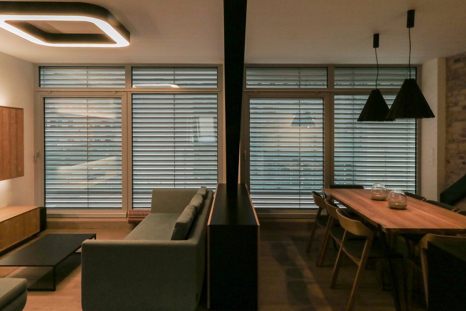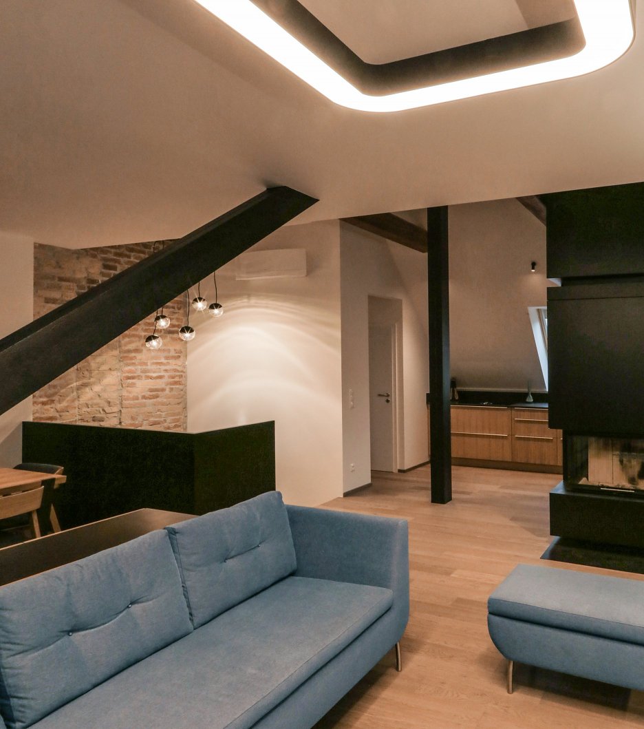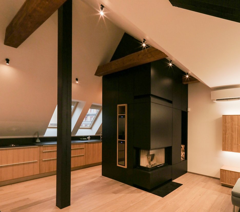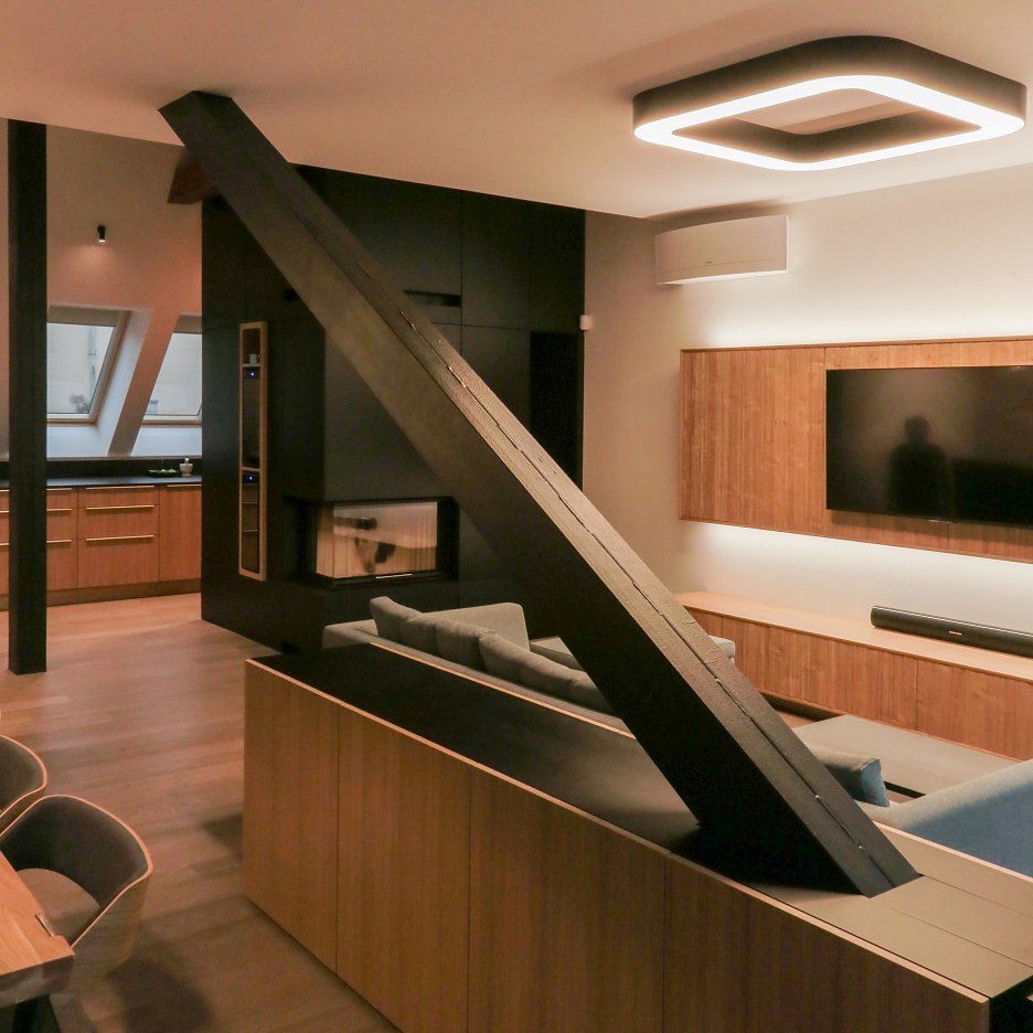 • Moderný podkrovný byt v historickom objekte v centre mesta. Formálne redukované výrazové prostriedky a zároveň členité zákutia jednotlivých priestorov.