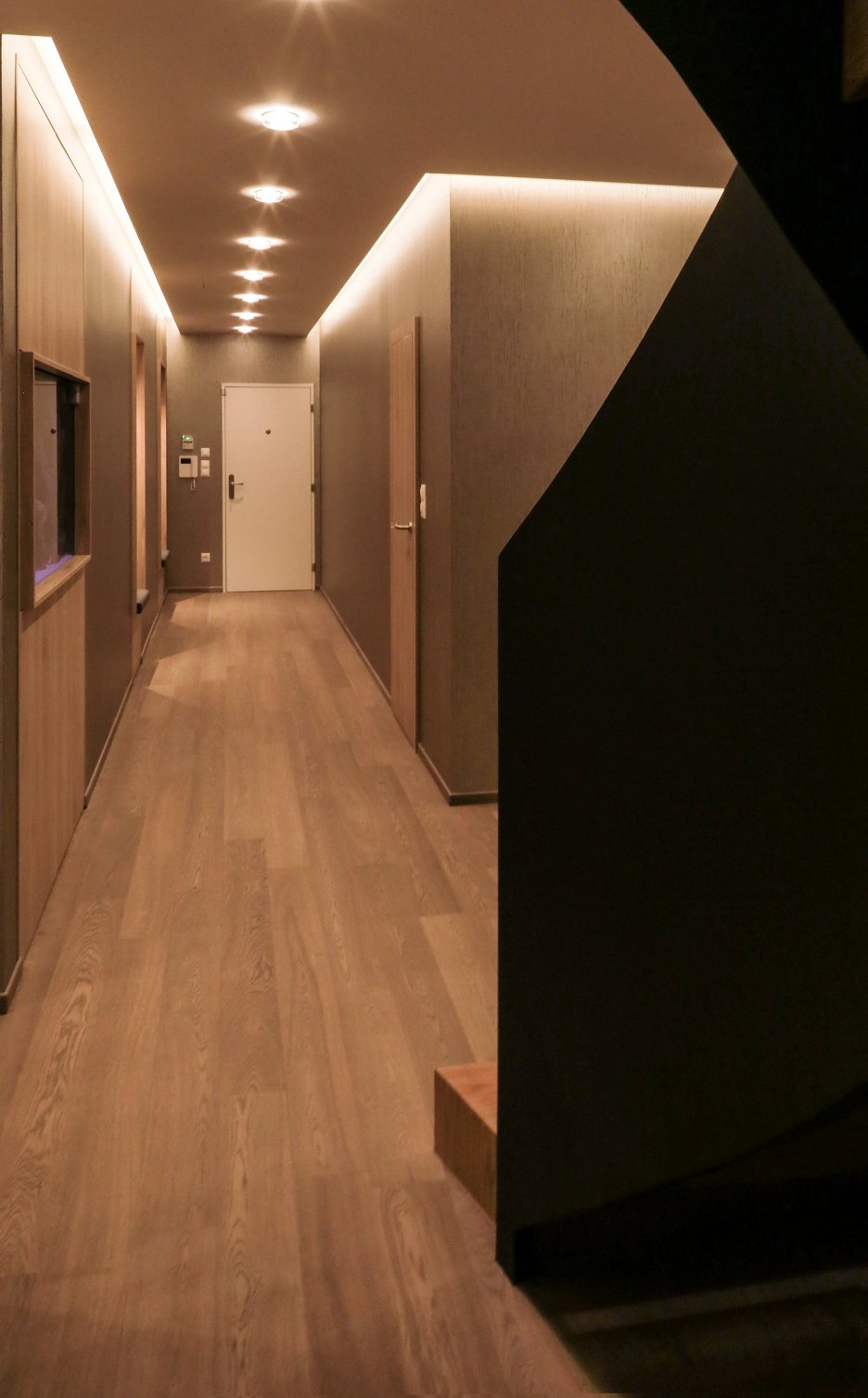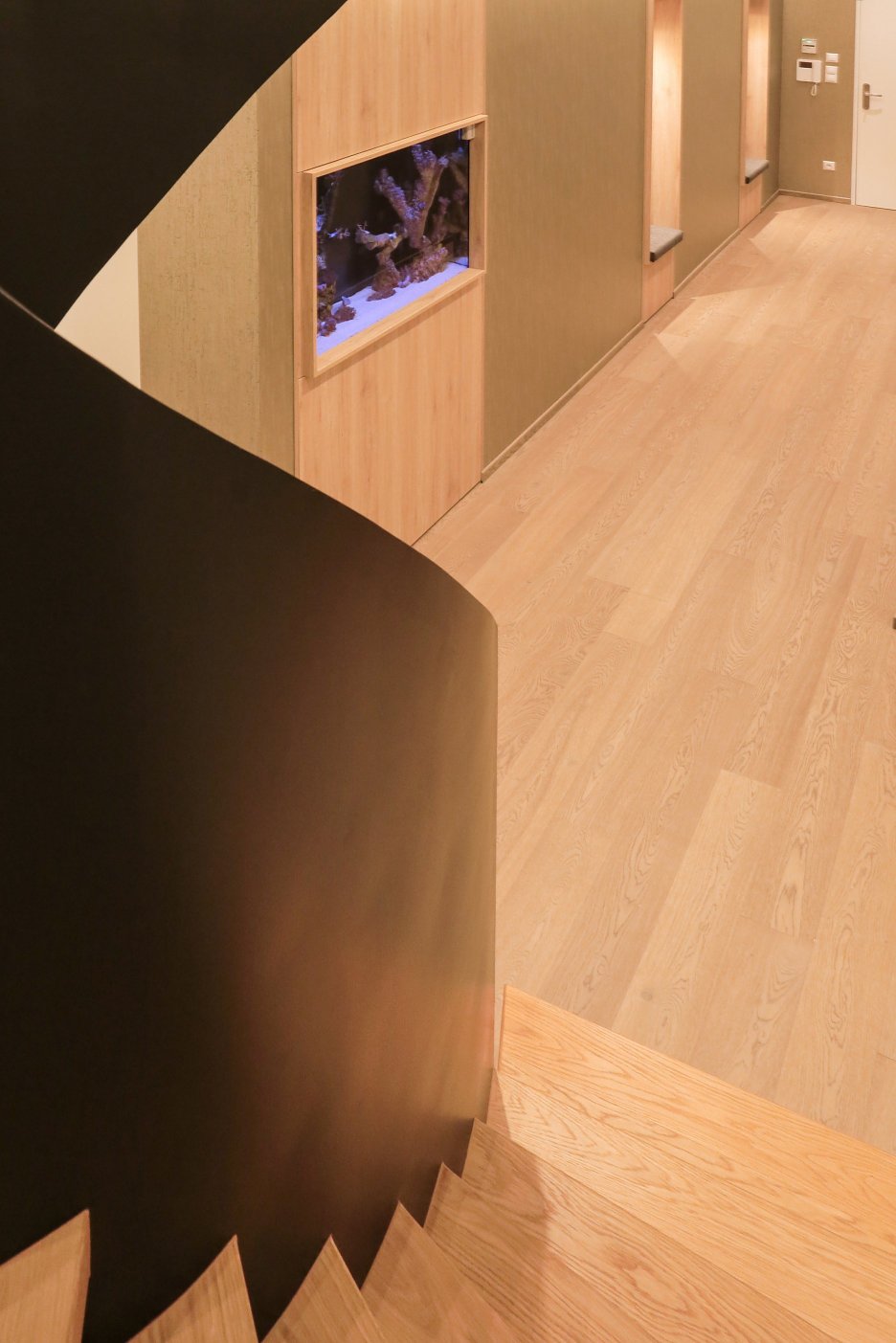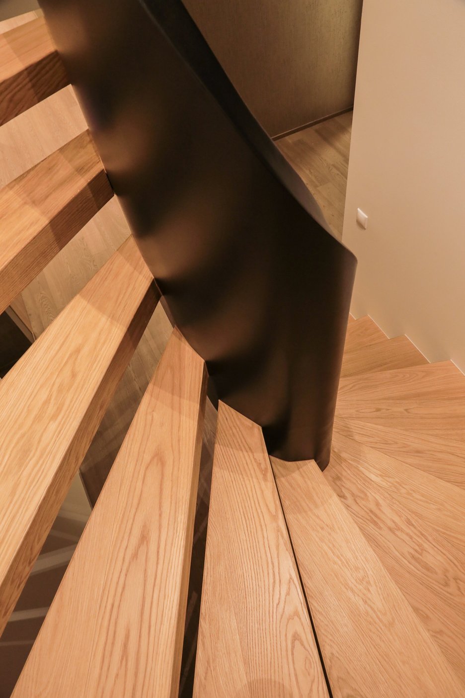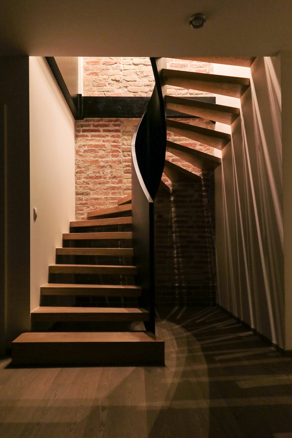 Najvýraznejším prvkom v interiéri je vretenové schodisko, ktoré zaujme hneď po vstupe do bytu. Solitérny prvok vyniká na pozadí tehlovej steny. Jediným viditeľným nosným prvkom je organická krivka čierneho vretena, ktoré slúži zároveň ako zábradlie. Dubové stupne sú po obvode kotvené oceľovými nosníkmi zabudovanými v sadrokartónovej stene.