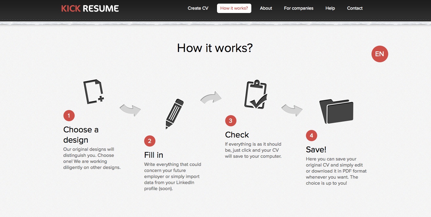 V súčasnosti funguje portál v beta verzii, stále sa vychytávajú chyby a nedokonalosti. Napriek tomu už o ňom stihol napísať StartupTunes alebo Times Of India. Funguje veľmi jednoducho – vyberiete si dizajn, vyplníte údaje a uložíte v pdf. Neskôr sa k nemu môžete vrátiť a upravovať ho. Služba je ponúkaná zadarmo. Kickresume je študentský projekt, a tak neboli potrebné žiadne externé financie. Do budúcnosti však zakladatelia túto možnosť nevylučujú. Ako jeden zo spôsobov spomínajú stále populárnejší crowdfunding.
