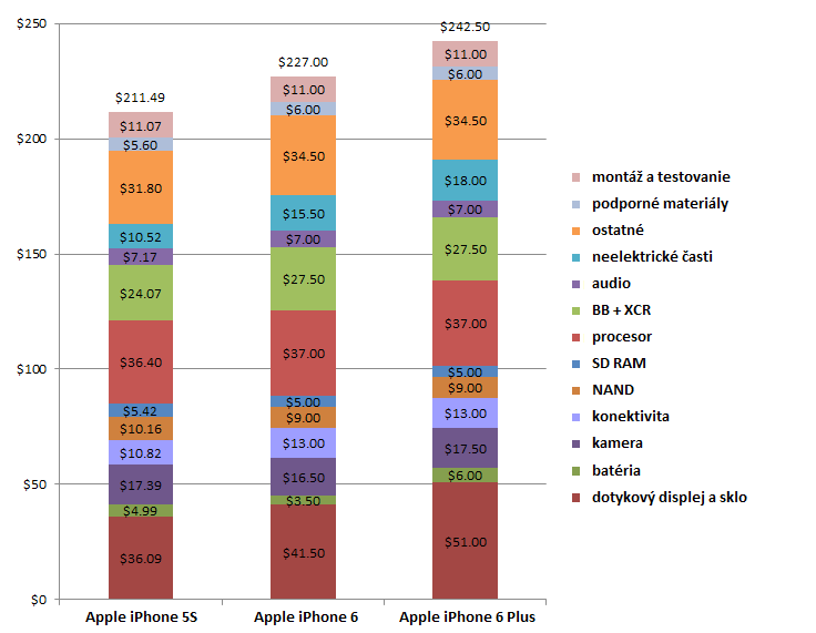 Výroba klasického iPhonu stojí približne 200 eur pričom výroba toho väčšieho stojí Apple iba 215 eur. Najväčšiu položku týchto nákladov tvorí samozrejme displej, na ktorom si všetci majitelia väčších telefónov potrpia. A práve ten sa podieľa najväčšou časťou na rozdiele výrobných nákladov medzi iPhonom 6 a 6 Plus. Druhou najdrahšou položkou je super rýchly procesor, súčiastka, ktorá tvorí mozog zariadenia. Pri jeho vývoji Apple spolupracuje so spoločnosťou Samsung.