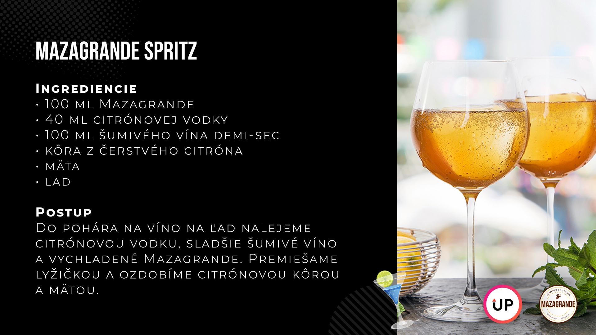 Nezameniteľnú chuť v Mazagrande Spritze zabezpečí citrónová vodka, šumivé víno, kôra z čerstvého citróna na dochutenie a ľad. Toto všetko treba preliať vychladeným Mazagrande a pridať lístky mäty na dozdobenie.