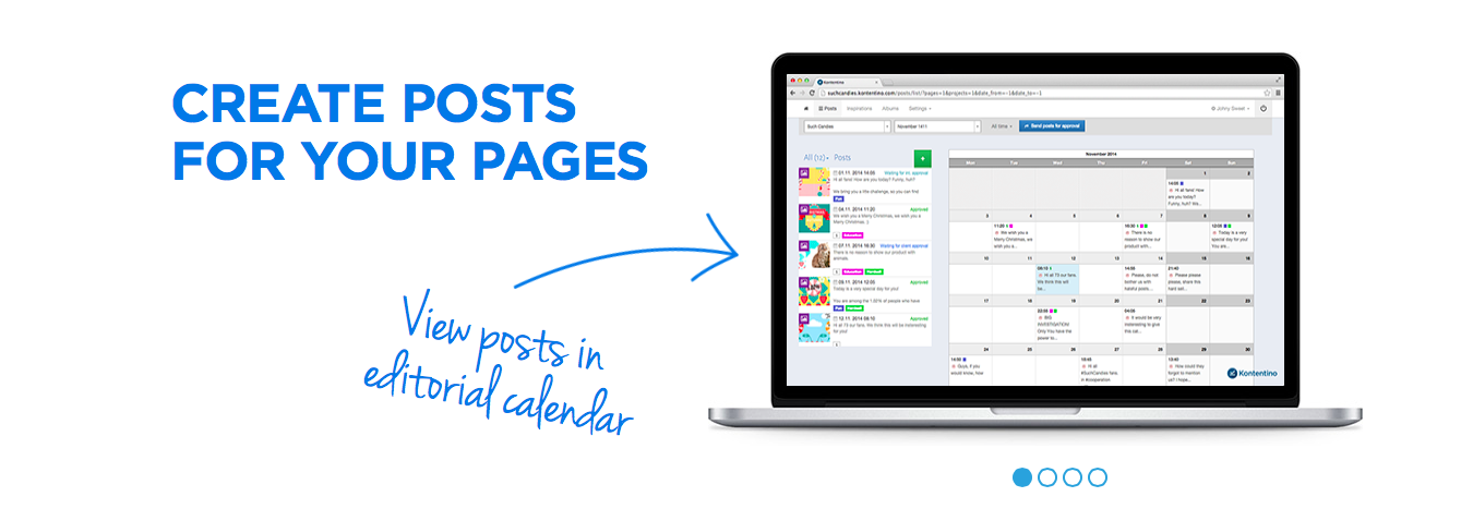 Kontentino je prehľadný kalendár a plánovač postov na Facebook. Slúži na veľmi jednoduché a intuitívne plánovanie a schvaľovanie postov. Podľa toho, akú zohrávate úlohu pri príprave postu, máte priradenú funkciu (admin, manažér, klient, grafik a prekladateľ). Ako social media manažér môžete v Kontentine vytvárať a plánovať posty pre stránky, ktoré spravujete, spolupracovať na príprave postov s grafikmi alebo prekladateľmi.