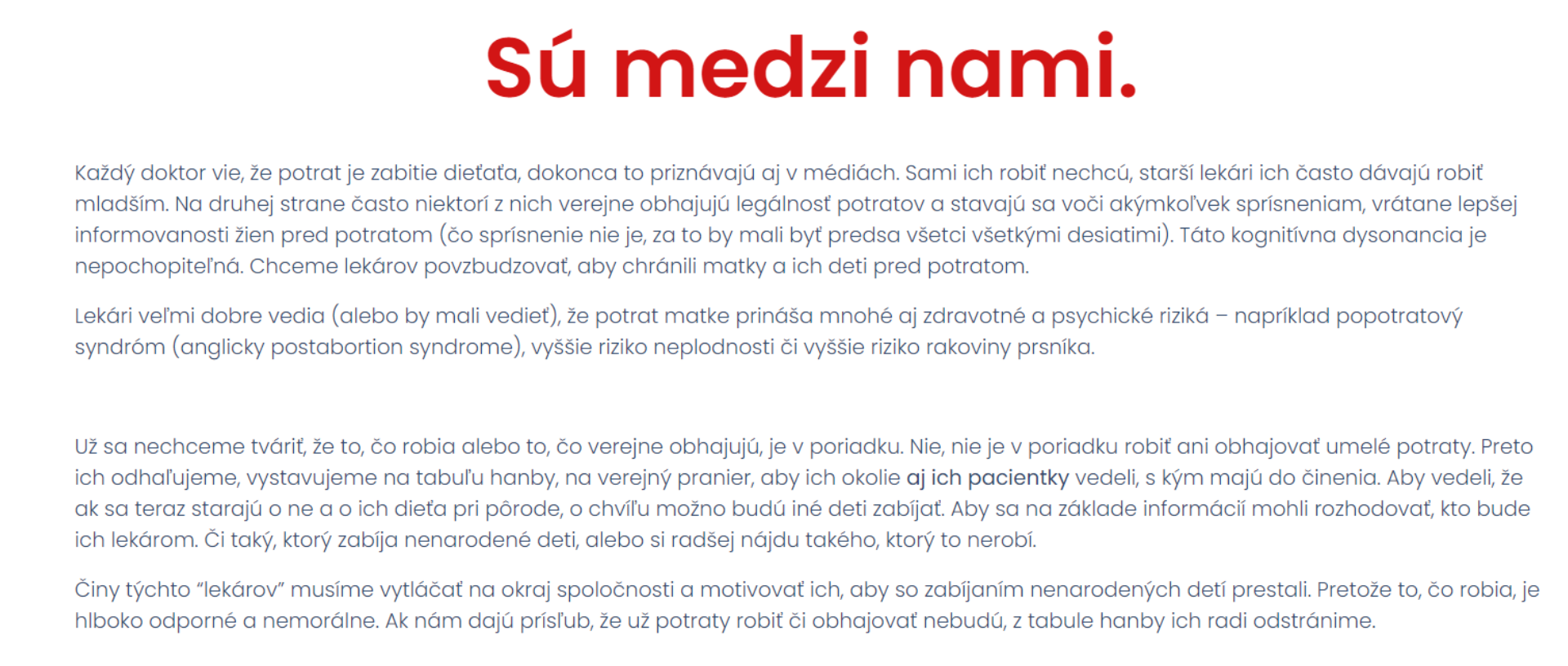 „Už sa nechceme tváriť, že to, čo robia, alebo to, čo verejne obhajujú, je v poriadku. Nie, nie je v poriadku robiť ani obhajovať umelé potraty. Preto ich odhaľujeme, vystavujeme na tabuľu hanby, na verejný pranier, aby ich okolie aj ich pacientky vedeli, s kým majú do činenia,“ píše sa ďalej na stránke.