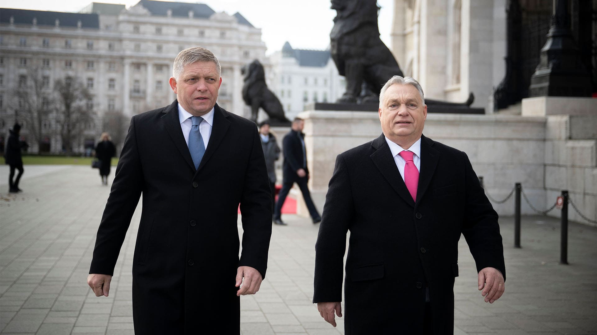 Maďarský premiér Viktor Orbán (vpravo) a slovenský premiér Robert Fico pred budovou parlamentu v Budapešti