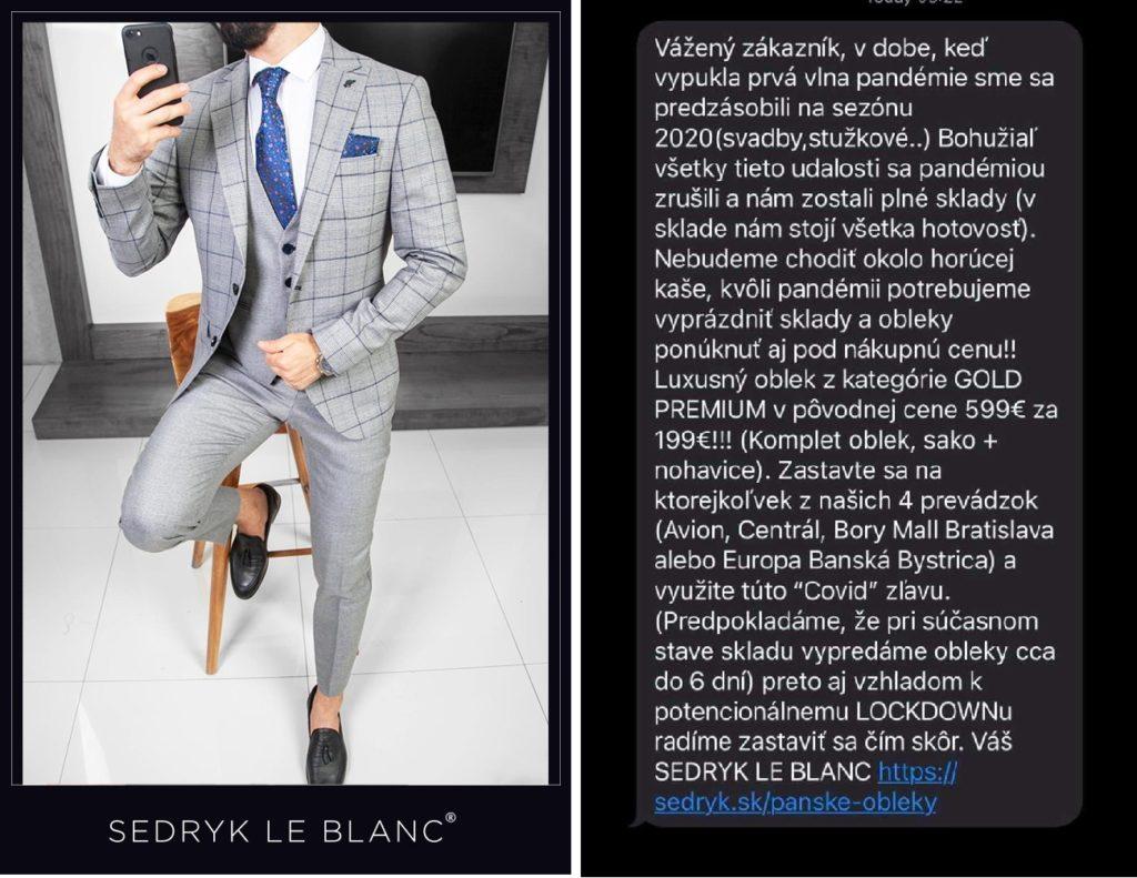 Koronakríza zasiahla aj jednu z najluxusnejších značiek pánskych oblekov na Slovensku, francúzsky Sedryk le Blanc. Svojím zákazníkom začali posielať dokonca SMS správy, kde informujú o svojich obrovských zľavách a vyzývajú k rýchlemu nákupu. Ako v správach píšu, sklady sa im zaplnili nevykúpenými oblekmi, a tak ich dnešné dni ponúkajú dokonca pod nákupnú cenu.