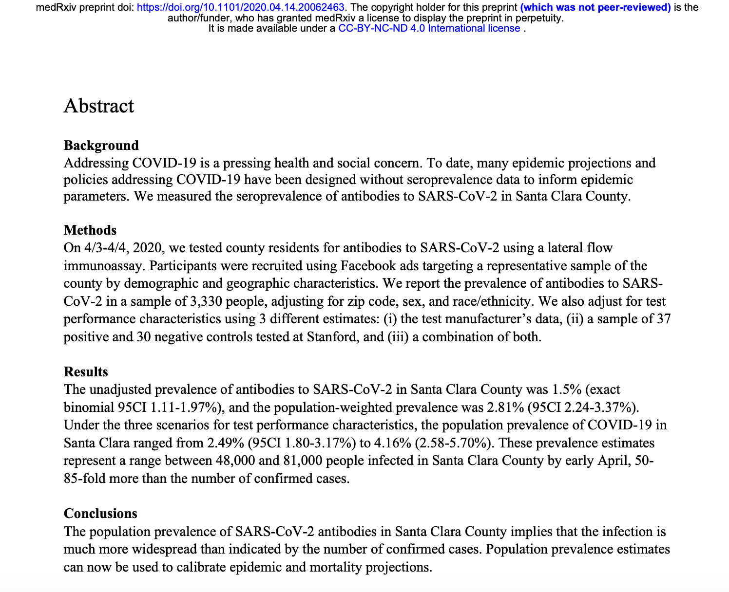 Podľa britského denníku The Guardian ide o prvú podobnú štúdiu na takto rozsiahlej vzorke. Jej výsledky sú priam šokujúce – zatiaľ čo v čase zberu dát bolo totiž v okrese Santa Clara „oficiálne“ nakazených len 1 094 ľudí a päťdesiati zomreli, keď sa výsledky štúdie vztiahnu na celú populáciu okresu, reálny počet pravdepodobne nakazených ľudí nám stúpne na 48-tisíc až 81-tisíc.