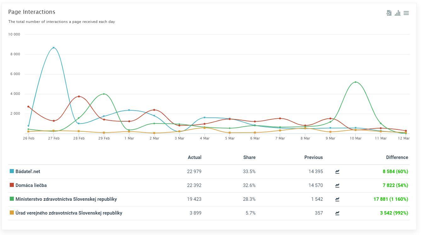 Podľa tohto grafu, ktorý môžeš vidieť dole, je počet interakcií najväčší na konšpiračnom webe badatel.net a na konšpiračnom webe Domáca liečba. Naproti tomu stoja dve štátne inštitúcie, ktoré mali interakcií o pár tisíc menej.