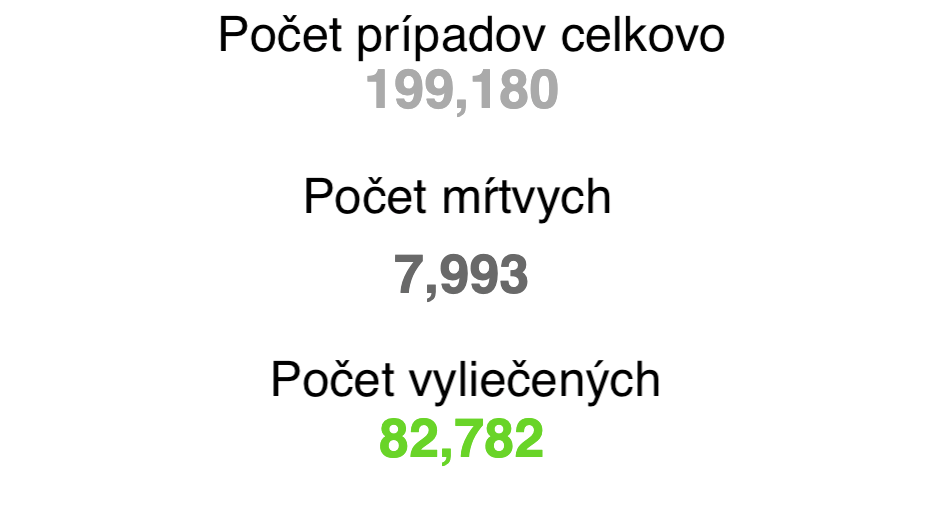 8:00 Vo svete sa počet nakazených blíži ku hranici 200 000. Najviac prípadov má stále Čína, no má vysoký podiel uzavretých prípadov (tj. ľudia, ktorí sa vyliečili alebo zomreli). Nasleduje Taliansko (31 506) a Irán (16 169).
