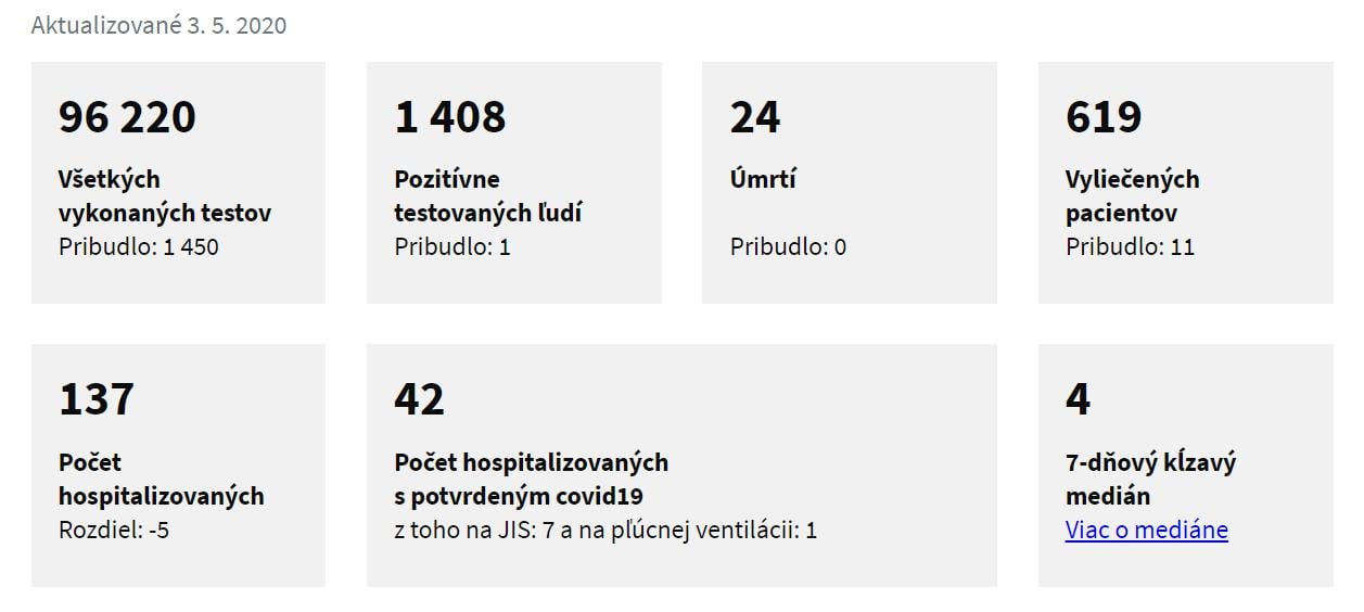 V sobotu potvrdili jeden nový prípad ochorenia Covid-19. Národné centrum zdravotníckych informácií o tom informovalo na webe covid-19.nczisk.sk. Celkovo je tak na Slovensku 1 408 ľudí pozitívnych na toto ochorenie. Laboratóriá urobili v sobotu 1 450 testov. Celkovo tak otestovali už vyše 96-tisíc vzoriek. Chorobe nepodľahla žiadna ďalšia osoba, Slovensko tak stále eviduje 24 úmrtí pacientov s pozitívnym testom na Covid-19. Z ochorenia sa vyliečilo ďalších 11 osôb, uzdravilo sa spolu už 619 ľudí.