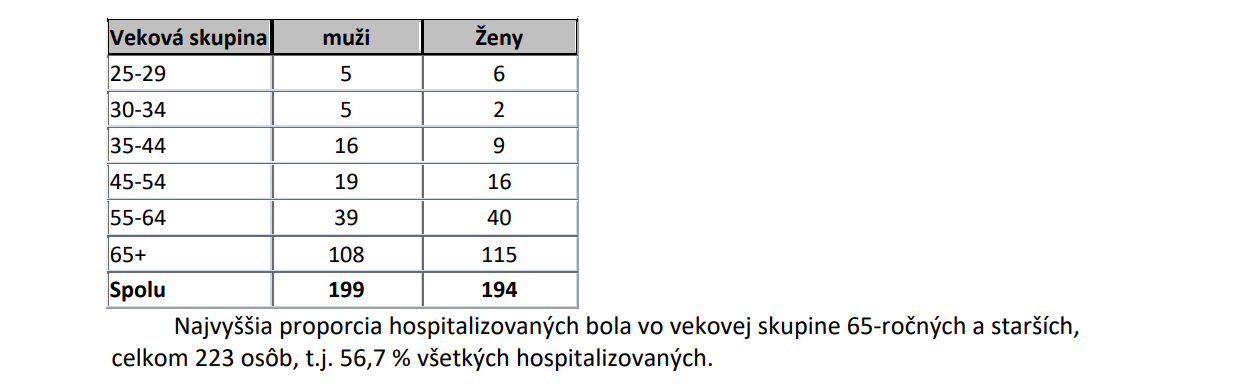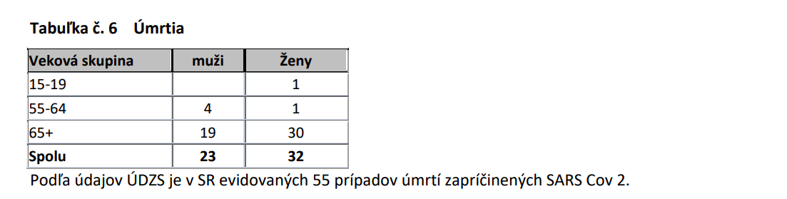 Hygieničky vypracovali aj štatistiku úmrtí. Ako vidno, úmrtia vo väčšej miere hrozia ľuďom, ktorí sú už postarší, teda 55 rokov a vyššie. Jedno úmrtie evidujeme aj v kategórii 15-19 rokov, pravdepodobne ide o 16-ročné dievča, ktoré zomrelo v nemocnici začiatkom septembra.